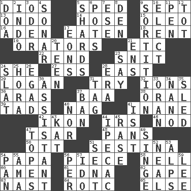 ACROSS 1. "Vaya con ____" 5. Broke a traffic law 9. Back-to-school mo. 13. Southwest Nigerian state 14. Stockings 15. Margarine 16. An important port of Yemen 17. Eroded 18. Monthly bill 19. Speakers 21. And so on (abbr.) 22. Tear apart 23. In a ____ (agitated or irritated) 24. A female animal or person 27. Double-curved letter 28. 90 degrees 29. Utah city north of Ogden 31. Attempt 32. Charged atoms 36. Ancient river in northeast Turkey 37. Sound made by sheep 38. Taken by mouth 39. Bits 40. Tired old horse 41. Lacking in sense or substance 42. Visual representation of an object 44. Big collection agency 46. Dreamland 47. Russian ruler of old 48. Zero-star reviews 50. Baseball player Mel 51. French poetic form 54. Dad 56. Part 58. 1994 drama film starring Jodie Foster 60. So be it 61. Pulitzer Prize-winning author Ferber 62. Yawn 63. Political cartoonist Thomas 64. College mil. group 65. Otherwise DOWN 1. ___ good deed 2. Southeast Asian peninsula 3. River in Europe 4. Echolocation 5. Pottery fragments 6. Plant holders 7. Compass dir. 8. Lair 9. Drawing lots 10. Opt 11. Fenced enclosure 12. Small child 17. Immeasurably long periods of time 20. Adolescent 21. Followers of ems 23. Declare 24. Narrow board 25. Israeli folk dance 26. Mild oath 28. Epoch 30. Helper 31. Label 33. Northwest Algerian city 34. Billionth: prefix 35. Downhill vehicle 37. Bar 40. And not 41. Is not 43. Krazy ___ of comics 44. Medicinal drug used to evoke vomiting 45. Raze (variant) 47. Drinks excessively 49. Burn superficially 51. Emitted 52. Anneal 53. High mountains 54. Baking dish 55. Wet nurse (var.) 56. For each 57. Wedding promise 59. Area sheltered from the wind