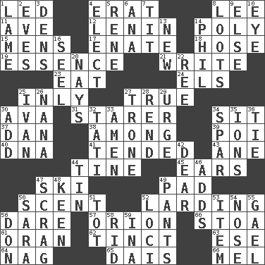ACROSS 1. Directed 4. Part of Q.E.F. 8. Area sheltered from the wind 11. "___ Maria" 12. Soviet premier 1918-24 14. Much (prefix) 15. Not women's 17. Maternal 18. Flexible conduit 19. Core 21. Compose 23. Ingest 24. Raised railways 25. Inwardly 27. Loyal 30. Actress Gardner 31. A viewer who gazes fixedly 34. Be seated 37. Daniel's nick name 38. Amid 39. Luau course 40. Heredity factor (abbr.) 41. Looked after 43. A saturated hydrocarbon 44. Prong on a fork 45. Hearing organs 47. What Jean-Claude Killy likes to do 49. Writing tablet 50. Aroma 52. Preparing or cooking with lard 56. Have the gumption 57. Constellation of myth 60. Portico 61. Northwest Algerian city 62. Colored lightly or faintly 63. Compass dir. 64. Tired old horse 65. Raised platform 66. Cartoonist voice _ Blanc DOWN 1. Unable to walk 2. Nights before holidays 3. Cub Scout units 4. Choose 5. French philosopher Descartes 6. Santa ___, CA 7. Teat (slang) 8. Plunders 9. Otherwise 10. Sight organ 13. ___ Haven, CT 14. Silvers or Donahue 16. Stitch closed the eyes of (a falcon) 20. Negative votes 22. To riddle 25. "Terrible" tsar 26. Grandmother 27. Marketplace scale 28. Tear apart 29. Goad 30. Say or write further 32. Jacques of French films 33. So be it 34. Practice fight 35. Charged particles 36. Standoff 42. Letter starter 44. Metal container 46. Does sums 47. Strangle with an iron collar 48. Peachy ____! 49. Leg coverings 50. "Two Mules for Sister ____" 51. Small child 52. Event scenes 53. A whole individual unit 54. Sense of smell 55. Highlander 56. Spanish title 58. To free from 59. _ tizzy (2 wds.)