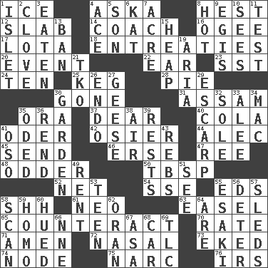 ACROSS 1. Frozen water 4. "____ silly question..." 8. Command 12. Thick slice 14. Team commander 16. Double curve, resembling the letter S 17. Globular water bottle used in Asia 18. Pleas 20. Happening 22. Ewer handle 23. Fast jet (abbr.) 24. "___ Little Indians" 25. Cask 28. Sliced dessert 30. Went 31. Indian state 35. Mouth or opening 37. Letter starter 40. Root beer relative 41. Baltic tributary 42. Flexible twig of a willow tree 44. Actor Baldwin 45. Post 46. Celtic language 47. To separate or throw off 48. More peculiar 50. Cook's measure (abbr.) 52. Fish or hair follower 54. Compass dir. 55. Begley and Asner 58. Quiet! 61. Modern: prefix 63. Artist's stand 65. Frustrate 70. Assign a rank or rating to 71. So be it 72. Relating to the nose 73. Supplemented with great effort 74. Thickened enlargement 75. Drug cop 76. Big collection agency DOWN 1. Small island 2. Garlic unit 3. Ingested 4. Adept person 5. Manchild 6. Krazy ___ of comics 7. Measure of real estate 8. Being at a high temperature 9. The front part of a cuirass 10. Observes 11. Trial 13. Forbid 15. Pile 19. Operatic vocal solo 21. Ring climax 26. Inside; within (prefix) 27. Honkers 29. Fortification 30. Place where plants grow 32. Not divided or shared with others 33. Toward shelter 34. Apple computer (short form) 35. Wrote a lyric poem 36. Tear apart 38. Atmosphere 39. Musical pauses 41. Bear (Spanish) 43. Confederate soldiers (slang) 49. Monthly bill 51. Perceive with the eye 53. Adolescent 55. 1973 Nobel Price Winner (Physics) Leo 56. Prevent from occurring 57. Bobsleighs 58. Examine hastily 59. Same (prefix) 60. Took on color 62. NW Algerian seaport 64. "We ___ not amused" (Victoria) 66. Compass dir. 67. White ___ sheet 68. Auto 69. Affectionate concern, for short
