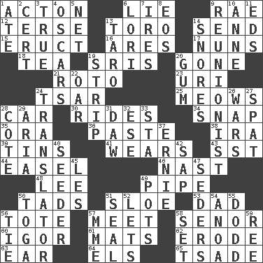 ACROSS 1. 13-14th century defensive garment 6. Whopper 9. Actress Charlotte 12. Laconic 13. "Corrida" creature 14. Transmit 15. Spew [out] 16. Ancient Greek god of war 17. Religious women 18. Beverage made from leaves 19. Indian titles of respect 20. Went 21. Printing process, for short 23. RI univ. 24. Russian ruler of old 25. Catcalls? 28. 4-wheeled motor vehicle 30. Amusement-park features 34. Fastener 35. Mouth or opening 36. Thick mixture 38. Retirement account (abbr.) 39. Metal containers 41. Erodes 43. Fast jet (abbr.) 44. Artist's stand 46. Political cartoonist Thomas 48. Area sheltered from the wind 49. Corncob 50. Small amounts or degrees 51. A type of plum 53. June honoree 56. Haul 57. Confront 58. Sir (Sp.) 60. Russian composer Stravinsky 61. Floor protectors 62. Wear away 63. Hearing organ 64. Raised railways 65. Sadhe (variant) DOWN 1. Had dinner 2. Sure thing 3. Loyal 4. Motion picture awards 5. Fish or hair follower 6. Australian parrot (variant) 7. Angers 8. Greek goddess of the dawn 9. One who advocates reunion 10. Queen of England 1702-14 11. Begley and Asner 13. Pacific island yam 14. Sounds asleep 19. Empty completely 20. Chewing product 22. Rowing implement 24. Interpreter 26. Armed conflicts 27. Petty quarrel 28. ____ d'Azur (French Riviera) 29. Operatic vocal solo 31. Obsolete 32. Compass dir. 33. R.R. building 37. Bert's buddy 40. Sowing specialist 42. Plant excrement 45. French article 47. Spring feasts 49. Plant holders 50. Ancient Roman robe 51. Lick closed 52. Allows 54. Small Philippine buffalo 55. Texas town _ City 56. Make a knot 57. Madame (abbr.) 58. Put into a specified state 59. Portuguese money of account (variant)