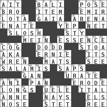 ACROSS 1. Small island 4. Indonesian resort city 8. Airs 12. Sis' sibling 13. A whole individual unit 14. Arab leader 15. Globular water bottle used in Asia 17. Greek goddess of the earth (variant) 18. Sports stadium 19. Maternal 21. Slangy assent 23. Fish or hair follower 24. Agitate, as a liquid 26. Filthy place 28. Chow _ 30. Core 34. Gear tooth 37. Texas town _ City 39. Portico 40. Alias (abbr.) 41. Bert's buddy 43. It is 44. Songbird 46. Floor protectors 47. Observe 48. Deli grouping 51. Plant excrements 54. Separate the seeds from cotton 55. A salt of uric acid 58. Cuckoo 61. Baking dish 63. Eat (away) 65. Yearns 67. Ubangi River tributary 71. Slanted text style (abbr.) 72. Queen of England 1702-14 73. Negative votes 74. Raised railways 75. Characteristic smell of wine 76. Proofreading order 77. Portuguese money of account (variant) DOWN 1. Competent 2. Removes the wrinkles 3. Add up to 4. Large 5. _ moment's notice (2 wds.) 6. Flowery wreath 7. "If ____ say so..." 8. For each 9. Presage 10. Trig term 11. Part of Q.E.F. 16. Tiny particle 18. Flats, for short 20. Compass dir. 22. Curvy letter 25. Flintstone garb 27. Consenting reply 29. Typical standards 30. Prepares for publication 31. Nuclear Threat Initiatives 32. ____ d'Azur (French Riviera) 33. Relaxation 34. Crow sounds 35. Gumbo ingredient 36. Highlander 38. Heredity factor (abbr.) 42. Son of Isaac 45. Tired old horse 49. Atlas contents 50. _ tizzy (2 wds.) 52. Before (prefix) 53. Indian skirt 56. Carrier 57. Peak District village in England 58. ____ Jay Lerner 59. Words to Nanette 60. Taverns 62. Religious women 64. Otherwise 66. Turn to the right 68. Ingest 69. Sodium hydroxide 70. Eastern Standard Time (abbr.)