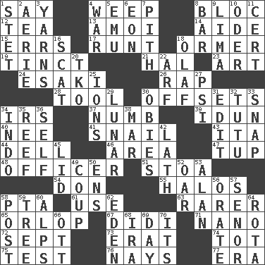 ACROSS 1. Declare 4. Shed a tear 8. Coalition 12. Afternoon social gathering 13. Mine, in Marseilles 14. Assistant 15. Blunders 17. The smallest animal of a litter 18. Channel Islands abalone 19. Colored lightly or faintly 21. Actor Linden 23. Nonscientific branch of learning 24. 1973 Nobel Price Winner (Physics) Leo 26. Strike 28. Implement 30. Counterbalances 34. Big collection agency 37. Unfeeling 39. Goddess of spring and wife of Bragi 40. Born 41. Slow-paced one 43. Call ___ day 44. Small valley 46. Length times width 47. Uncastrated adult male sheep 48. Person of authority 51. Portico 54. Spanish title 55. Saint headwear 58. Parent Teacher Assoc. 61. Purpose 63. More uncommon 65. Fourth or lowest deck 67. "You Light Up My Life" star Conn 71. Billionth: prefix 72. Back-to-school mo. 73. Part of Q.E.F. 74. Small child 75. Trial 76. Negative votes 77. Epoch DOWN 1. Proofreading order 2. Nest on high 3. Entertaining tales 4. Armed conflict 5. Australian flightless bird 6. Age 7. Heart or essence 8. Long, evenly shaped piece 9. Pale green bean 10. Baltic tributary 11. An absolute certainty 16. Get outta here! 18. Norwegian king 20. Ring climax 22. Sandy's bark 25. Charged atoms 27. Air pressure measure (abbr.) 29. Type of eclipse 30. Off-Broadway awards 31. Prepare for publication 32. Ballerina skirt 33. Fastener 34. Southeast Asian peninsula 35. Coral collection 36. Automatically 38. Impair 42. Thin strip of wood or metal 45. Hat (slang) 49. Clever action or accomplishment 50. Followers of ems 52. Rowing implement 53. Actor Alda or Thicke 56. Declaim 57. Sir (Sp.) 58. Mail 59. Woody plant 60. High mountains 62. Locale of original sin 64. Roll call or roster of names 66. Baseball player Mel 68. Lyricist Gershwin 69. 24 hours 70. ___ a Wonderful Life