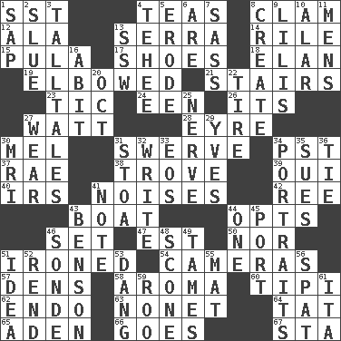 ACROSS 1. Fast jet (abbr.) 4. Afternoon social gatherings 8. Burrowing marine mollusk 12. Wing 13. Spanish missionary in California 14. Cause heat under the collar 15. Monetary unit of Botswana 17. Imelda's hoard 18. Liveliness 19. Turned at an angle; bent 21. Flight of steps 23. Nervous spasm 24. Car or cant ending 26. ___ a Wonderful Life 27. Electrical Unit 28. Jane of fiction 30. Cartoonist voice _ Blanc 31. Turn aside suddenly 34. Pacific Standard Time (abbr.) 37. Actress Charlotte 38. Collection of objects 39. Fr. "Yes" 40. Big collection agency 41. Annoying sounds 42. To sift 43. Water vessel 44. Elects 46. Put into a specified state 47. Eastern Standard Time (abbr.) 50. Not either 51. Pressed 54. Devices for capturing images 57. Hiding places for outlaws 58. Odor 60. Native american tent (variation) 62. Inside; within (prefix) 63. Music written for nine 64. Make lace 65. Arabian gulf 66. Leaves 67. R.R. building DOWN 1. Plant excrement 2. Change direction abruptly 3. Baron Munchausen's specialties 4. Giggle 5. Eat (away) 6. "We ___ not amused" (Victoria) 7. Backtalk 8. Cause to be 9. Ms. Damita and namesakes 10. Having or resembling wings 11. Not women's 13. Compass dir. 16. "This won't hurt ____!" 20. Sep. follower 22. Hoop that covers a wheel 25. Impudent aggressiveness 27. Put on (as clothing) 29. Jacques Cousteau's middle name 30. Medical imaging device (abbr.) 31. Portico 32. Compose 33. Greek goddess of the dawn 34. Likenesses of persons 35. Takes to court 36. Make a knot 41. Make mention of 43. Gillaume's butler role 44. Single 45. Sweet dark-red dessert wine 46. Message 48. Biscuitlike quick bread 49. Corrects by punishment or discipline 51. The main thing one is thinking about 52. Tear apart 53. Mild oath, euphamism for damn 55. Floor covering 56. Petty quarrel 59. Friend of Pooh 61. Call ___ day