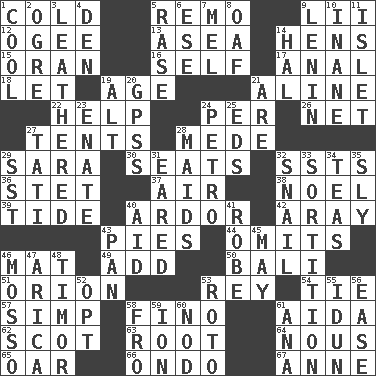 ACROSS 1. Having a low temperature 5. San ____ (Riviera town) 9. Cards in a Roman deck? 12. Double curve, resembling the letter S 13. Toward the sea 14. Coop moms 15. NW Algerian seaport 16. Oneself 17. Of or related to the anus 18. Allow 19. Grow older 21. Place in a line 22. Assist 24. For each 26. Fish or hair follower 27. Portable shelters 28. Ancient Persian 29. "Two Mules for Sister ____" 30. Theater features 32. Fast planes 36. Proofreading order 37. Wind 38. Christmas carol 39. Event that recurs at intervals 40. Zeal 42. Like ___ of sunshine 43. Sliced desserts 44. Leaves out 46. Floor covering 49. Increase 50. Indonesian resort city 51. Constellation of myth 53. Marina Del _, California 54. Neckwear 57. Simple or foolish person 58. A pale, very dry sherry 61. Opera by Verdi 62. Highlander 63. Carrot, for example 64. Good sense 65. Rowing implement 66. Southwest Nigerian state 67. Singer Murray DOWN 1. Calm and collected 2. Legendary monster 3. Tough but pliablecoriaceous 4. Lair 5. Raze (variant) 6. Compass dir. 7. Cartoonist voice _ Blanc 8. Clumsy lout 9. Soviet premier 1918-24 10. Empty; void 11. Small island 14. Actor Linden 19. The first octave above the treble staff 20. Global Positioning Systems (abbr.) 21. "We ___ not amused" (Victoria) 23. Maternal 24. Stone: prefix 25. Begley and Asner 27. Jacques of French films 28. Unmarried girls 29. Fast jet (abbr.) 31. Having ears or earlike features 32. Slow-paced one 33. Decision 34. Beverages made from leaves 35. Mischievous 40. Assist 41. Loose flowing garment 43. Baking dish 45. Fifth month 46. With motion or animation 47. N. Chile seaport 48. The easternmost of the Lesser Sundas 52. Elect 53. Printing process, for short 55. Goddess of spring and wife of Bragi 56. Relaxation 58. Back 59. Electrically charged atom 60. Allow head to fall sleepily 61. Santa ___, CA