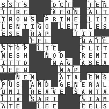 ACROSS 1. Fast planes 5. Sep. follower 8. "___ Little Indians" 11. Become fatigued 12. A really long time 14. The first octave above the treble staff 15. Removes the wrinkles 17. First class 18. Cards in a Roman deck? 19. Small, flat, pigmented spot on the skin 21. Allow 22. French article 23. Compass dir. 24. Hit sharply and swiftly 25. Teat (slang) 27. Snakelike fish 28. Nathan's nickname 31. Halt 35. Whopper 37. Secret move to avoid paying debts 38. Delicate 39. Lower and raise head in agreement 41. Monthly bill 42. "Tell ____ the Marines!" 43. Tired old horse 45. At sea 46. Adolescent 47. Atlas unit 49. ___ Haven, CT 51. "One Day ___ Time" 52. Followers of ems 55. Tenth month of the Hindu calendar 57. Added to 60. Commissioned military rank 62. University (slang) 63. Break or tear apart 65. Before Barbara or Clara 66. 54 in ancient Rome 67. Indian skirt 68. Thailand, formerly 69. Had dinner 70. Area sheltered from the wind 71. Snakelike fish DOWN 1. Vertical member of a panel or frame 2. Fathers 3. Heavy duty weighing machine 4. Transmitted 5. Rowing implement 6. To provide with a ceiling 7. Heavy book 8. Baron Munchausen's specialties 9. Writer Wiesel 10. Nuclear Threat Initiatives 13. Remaining after all deductions 16. The founder of a family 17. Cotton for raincoats, e.g. 20. Highlander 26. Kind of red light 29. Prong on a fork 30. Singer James 31. In a ____ (agitated or irritated) 32. False hair 33. Clearly or manifestly demonstrative 34. Give a jingle 36. A really long time 40. Break 44. Yard entry 48. Zero-star reviews 50. Armed conflicts 52. Bert's buddy 53. Relating to or accompanying birth 54. Shuts with force 55. Monetary unit of Botswana 56. A single undivided whole 58. Be tempered by heat 59. Have the gumption 61. Relaxation 64. Compete