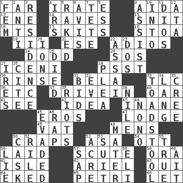 ACROSS 1. Distant 4. Feeling or showing extreme anger 9. Opera by Verdi 13. Compass dir. 14. All-night dance parties 15. In a ____ (agitated or irritated) 16. Mountains (abbr.) 17. Burlesque acts 18. Portico 19. One more than two 21. Compass dir. 22. Goodbye (Sp.) 24. Texas town _ City 26. Mayday 27. Ancient Celtic tribe of eastern Britain 29. Inconspicuous attention getter 30. Wash lightly 31. Actor Lugosi 33. Affectionate concern, for short 36. And so on (abbr.) 37. Popular '50s hangout 40. Rowing implement 41. Observe 42. The main thing one is thinking about 43. Empty; void 45. Greek god of love 47. Cabin 48. Large container 49. Not women's 50. Dice game 52. White ___ sheet 54. Baseball player Mel 56. Put down 57. Snake scale 59. Mouth or opening 61. Capri or Wright 62. Satellite of Uranus 63. Fr. "Yes" 64. Made supply last 65. _ dish (used to culture cells) 66. Allow DOWN 1. Opposite of masc. 2. Against 3. Dwelling 4. Big collection agency 5. Swept the length of 6. Opinion 7. Wig 8. Double-curved letter 9. Aid 10. To the inside or interior of 11. "Vaya con ____" 12. "One Day ___ Time" 20. Charged particles 22. Slender Brazilian palm 23. Two (Sp.) 25. Passed on 27. Angers 28. Quote 29. Entreaty 31. Auction offers 32. Night before a holiday 33. Inedible or poisonous agaric 34. Austrian-born American filmmaker Fritz 35. Algonquian 38. Disturbances 39. "Death on the ____" 44. Words to Nanette 45. Eluded 46. Reproach for some lapse or misdeed 49. Mother 50. Keg 51. Cause heat under the collar 52. 1/640 square mile 53. Set or collection 55. Loyal 56. Whopper 57. Plant excrement 58. Connecticut Ivy Leaguer 60. Small island