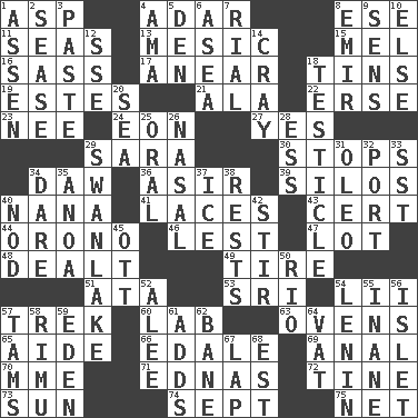 ACROSS 1. Viper 4. The sixth month of the Jewish calendar 8. Compass dir. 11. Oceans 13. Of or pertaining to a meson 15. Cartoonist voice _ Blanc 16. Backtalk 17. Approach 18. Metal containers 19. _____ Park, CO 21. Chicken ___ king 22. Celtic language 23. Born 24. Period of immesurable duration 27. It is so 29. "Two Mules for Sister ____" 30. Halts 34. Simpleton 36. SW Saudi Arabia district 39. Grain storage towers 40. Nanny 41. Shoestrings 43. Certainty 44. U. of Maine site 46. For fear that 47. Car dealer's back yard 48. Started a card game 49. Become fatigued 51. "One Day ___ Time" 53. Indian title of respect (Mr.) 54. Cards in a Roman deck? 57. Long journey 60. Experiment locale 63. Baking chambers 65. Helper 66. Peak District village in England 69. Of or related to the anus 70. Madame (abbr.) 71. Ferber et al. 72. Prong on a fork 73. Player for Phoenix 74. Back-to-school mo. 75. Fish or hair follower DOWN 1. NE Netherlands city 2. Gospel singer Marvin 3. Thick mixture 4. Nursemaid (var.) 5. Lair 6. Toward the sea 7. Monetary unit of Yemen 8. Independent ruler or chieftain 9. Elected reps. 10. Otherwise 12. Compass dir. 14. Supercomputer manufacturer 18. One of the two male reproductive glands 20. Ocean 25. Of the mouth 26. Relating to the nose 28. Double-curved letter 29. Tchaikovsky ballet 31. Margarine 32. Sweet dark-red dessert wine 33. Fast jet (abbr.) 34. Have the gumption 35. Small Philippine buffalo 37. Frozen water 38. Musical pauses 40. Allow head to fall sleepily 42. Use a spoon 45. Baseball player Mel 50. River (Sp.) 52. Toward shelter 54. Soviet premier 1918-24 55. Silly 56. Small island 57. Scottish caps 58. Tall New Zealand timber tree 59. Genesis locale 61. Sums up 62. Object of repulsion 64. Large container 67. Infant locale 68. Eastern Standard Time (abbr.)