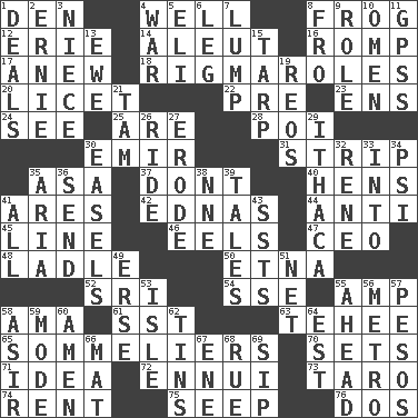 ACROSS 1. Lair 4. Water source 8. Toadlike animal 12. 4th largest of the Great Lakes 14. Eskimo relative 16. Frolic 17. Afresh 18. Complicated, petty procedures 20. It is permitted: Lat. 22. Before (prefix) 23. Followers of ems 24. Observe 25. "We ___ not amused" (Victoria) 28. Luau course 30. Arab leader 31. Remove all contents or possession from 35. White ___ sheet 37. Do not 40. Coop moms 41. Ancient Greek god of war 42. Ferber et al. 44. Against 45. Actor's bit 46. Snakelike fish 47. Corporate head (abbr.) 48. Dipping utensil 50. Inactive volcano in Sicily 52. Indian title of respect (Mr.) 54. Compass dir. 55. Electrical Unit 58. Housemaid (var.) 61. Fast jet (abbr.) 63. Giggle 65. Wine waiters 70. Arranges properly for use 71. It may be bright or harebrained 72. World-weariness 73. Edible starchy tuberous root 74. Monthly bill 75. Ooze 76. Two (Sp.) DOWN 1. Allots cards 2. Bert's buddy 3. Sibling's daughter 4. Armed conflict 5. Connecticut Ivy Leaguer 6. Part of a journey 7. Mass 8. From 9. Hero or heavy, e.g. 10. Sign of things to come 11. Global Positioning Systems (abbr.) 13. She-sheep 15. Canvas cover 19. Vintage cars 21. Scottish cap 26. Travel on an animal 27. Eat (away) 29. New York city 30. Artist's stands 32. French philosopher Descartes 33. To the inside or interior of 34. 23rd letter of the Greek alphabet 35. Roberta Peters solo 36. Transmit 38. Compass dir. 39. Lies 41. 100% 43. Fast planes 49. Celtic language 51. Fish or hair follower 53. Capri or Wright 55. Having the leading position 56. Paris' subway 57. Mexican monetary units 58. SW Saudi Arabia district 59. Method 60. So be it 62. Canisters 64. Eastern Standard Time (abbr.) 66. Floor protector 67. Compass dir. 68. Regret 69. Small drink