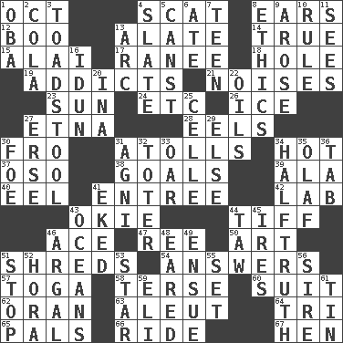 ACROSS 1. Sep. follower 4. Scram! 8. Hearing organs 12. Oct. 31 cry 13. Having winglike extensions 14. Loyal 15. Jai ____ 17. The wife of a rajah (variant) 18. Hollow 19. Inveterate users 21. Annoying sounds 23. Player for Phoenix 24. And so on (abbr.) 26. Frozen water 27. Inactive volcano in Sicily 28. Snakelike fish 30. From 31. Ringlike coral islands and reefs 34. Being at a high temperature 37. Bear (Spanish) 38. Purposes of endeavors 39. According to 40. Snakelike fish 41. Main course 42. Experiment locale 43. Migrant worker of the '30s 44. Small quarrel 46. Adept person 47. To sift 50. Tate display 51. Fragments 54. Responses 57. Ancient Roman robe 58. Laconic 60. Set of matching outer garments 62. Northwest Algerian city 63. Native American of Southwest Alaska 64. Three (prefix) 65. Friends 66. Travel on or in a vehicle 67. Layer DOWN 1. Chief or king in Benin or Nigeria 2. Root beer relative 3. Inedible or poisonous agaric 4. Chalkboard 5. 2nd pers. sing. pres. of can (arch.) 6. Had dinner 7. Adolescent 8. Principles of right and wrong 9. Came up 10. Court order 11. Perceives with the eye 13. Curve 16. Goddess of spring and wife of Bragi 20. _ tizzy (2 wds.) 22. Lubricates 25. Cell (Danish) 27. Celtic language 29. Otherwise 30. Enemy 31. Hindu god of fire 32. Carrier 33. Rowing implement 34. Not exactly gospel 35. Norwegian king 36. Bar bill 41. Supplemented with great effort 43. Seas 44. The 23rd letter of the Hebrew alphabet 45. Angers 46. Therefore, facetiously 48. Having ears or earlike features 49. Follow as a consequence or result 51. Obstruct or block passage 52. Israeli folk dance 53. Play the lead 55. Arrange properly for use 56. The founder of a family 59. Biblical high priest 61. Shallow baking pan