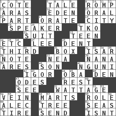 ACROSS 1. ____ d'Azur (French Riviera) 5. Lie 9. Play 13. Ancient river in northeast Turkey 14. Locale of original sin 15. Of the mouth 16. Component 17. Declaim 18. Municipality 19. Orator 21. Ring climax 22. Set of matching outer garments 23. Adolescent 24. And so on (abbr.) 27. Area sheltered from the wind 28. Incision 29. One of three equal parts 31. Gift holder 32. Austrian river, tributary to the Danube 36. Musical sound 37. Teachers' org. 38. Nanny 39. Ancient Greek god of war 40. Boy, to dad 41. Group of southern Bantu languages 42. Russian composer Stravinsky 44. Chief or king in Benin or Nigeria 46. Lair 47. Lyric poems 48. Take ten 50. Perceive with the eye 51. Electrical Measurement 54. Distinctive style or manner 56. Shops 58. Hero or heavy, e.g. 60. Actor Baldwin 61. Family _ (genealogy) 62. Oceans 63. Become fatigued 64. Transmit 65. Is not DOWN 1. Head covering 2. Mouths or openings 3. Canvas cover 4. _____ Park, CO 5. Cylindrical with tapered ends 6. The sixth month of the Jewish calendar 7. Allow 8. Compass dir. 9. Shooting up abruptly 10. Greek mythologigal hunter 11. Floor covering 12. Strand of rope, yarn or thread 17. Migrant worker of the '30s 20. Old (Scot.) 21. "___ Little Indians" 23. John Ritter's dad 24. Inactive volcano in Sicily 25. Son of Odin 26. Quote 28. ___ good deed 30. Dwelling 31. Benjamin's nick name 33. Saudi Arabian king (1953-1964) 34. Queen of England 1702-14 35. Precipitation 37. And not 40. Mayday 41. Political cartoonist Thomas 43. Unit of force equal to gravity 44. Spoke pompously 45. Antes 47. Flexible twig of a willow tree 49. Tarsus (plural) 51. Songbird 52. Leaves 53. Flair 54. Large container 55. Biblical high priest 56. Mountains (abbr.) 57. "We ___ not amused" (Victoria) 59. Eastern Standard Time (abbr.)