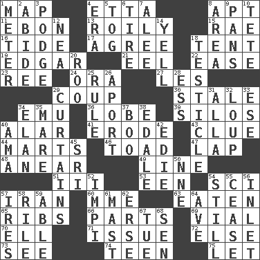 ACROSS 1. Atlas unit 4. Singer James 8. Fitting 11. Inky black, to poets 13. Turbulent 15. Actress Charlotte 16. Event that recurs at intervals 17. Match 18. Portable shelter 19. _ Allan Poe 21. Snakelike fish 22. Relaxation 23. To sift 24. Mouth or opening 27. French article 29. Overturn; upset 30. Lacking originality or spontaneity 34. Australian flightless bird 36. Ear part 39. Grain storage towers 40. Having or resembling wings 41. Eat (away) 43. A slight indication 44. Shops 46. Frog relative 47. Infant locale 48. Approach 49. Actor's bit 51. One more than two 53. Car or cant ending 54. _-fi 57. SW Asia republic 60. Madame (abbr.) 63. Ingested 65. Teases 66. Components 69. Small bottle 70. Pipe bend 71. Come out of 72. Otherwise 73. Observe 74. Adolescent 75. Allow DOWN 1. Distance measurement 2. Remain 3. Plash 4. Period 5. Coat; cloak 6. Become fatigued 7. Toward shelter 8. Type of rug 9. Zero-star reviews 10. False hair 12. Teachers' org. 14. Shout 18. A testis 20. Friend of Pooh 25. Court order 26. To the left, to Queeg 28. Double-curved letter 29. Window treatments 31. Silent film actress Nazimova 32. Central Nebraska county 33. Compass dir. 34. Liveliness 35. Female horse 37. Surprise greeting 38. Peak District village in England 40. Housemaid (var.) 42. Singer Brickell 45. Indian title of respect (Mr.) 50. Compass dir. 52. Body of Kaffir warriors 54. Free from disturbance or agitation 55. Desist 56. An arm off of a larger body of water 57. Angers 58. Cause heat under the collar 59. Competent 61. Vertical spar for supporting sails 62. Celtic language 64. "___ Maria" 67. Third day of the wk. 68. Elected rep.
