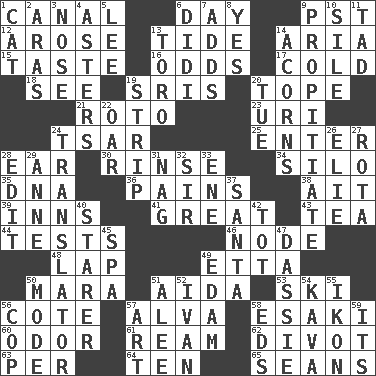 ACROSS 1. Lessep's creation 6. 24 hours 9. Pacific Standard Time (abbr.) 12. Came up 13. Event that recurs at intervals 14. Operatic vocal solo 15. Clothes sense 16. Probability 17. Lacking warmth 18. Observe 19. Indian titles of respect 20. Drink excessively 21. Printing process, for short 23. RI univ. 24. Russian ruler of old 25. Keyboard key 28. Hearing organ 30. Wash lightly 34. Grain storage tower 35. Heredity factor (abbr.) 36. Aches 38. Small island 39. Taverns 41. Relatively large 43. Beverage made from leaves 44. Trials 46. Thickened enlargement 48. Pet locale 49. Singer James 50. Hindu Mythology: god of death 51. Opera by Verdi 53. What Jean-Claude Killy likes to do 56. ____ d'Azur (French Riviera) 57. Inventor's middle name 58. 1973 Nobel Price Winner (Physics) Leo 60. Aroma 61. 480, 500 or 516 sheets of paper 62. A piece of turf (Scot.) 63. For each 64. "___ Little Indians" 65. Seines DOWN 1. Domesticated feline 2. Ancient river in northeast Turkey 3. Sense of smell 4. Michaelmas daisies 5. Area sheltered from the wind 6. "You Light Up My Life" star Conn 7. Does sums 8. Consenting reply 9. Conciliate 10. Drop; flow; fall 11. Bit 13. "Corrida" creature 14. Oak nuts 19. Remove all contents or possession from 20. Third day of the wk. 22. Boat paddle 24. Interpreter 26. Writer Wiesel 27. Roll call or roster of names 28. Prepare for publication 29. Singer Murray 31. Tired old horse 32. Title for a knight 33. Compass dir. 37. Before Barbara or Clara 40. A viewer who gazes fixedly 42. Small child 45. Health resort 47. Small ungulate mammals of Africa 49. Dutch treat 50. Method 51. Toward shelter 52. "Terrible" tsar 54. Polynesian shrub of the pepper family 55. Picture 56. Police officer (slang) 57. Tate display 58. Begley and Asner 59. It is