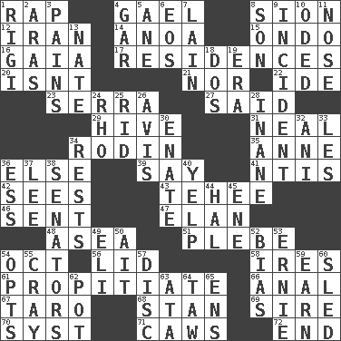 ACROSS 1. Reproach for some lapse or misdeed 4. Highlander 8. The Jewish people; Israel 12. SW Asia republic 14. Small Philippine buffalo 15. Southwest Nigerian state 16. Greek goddess of the earth (variant) 17. Dwellings 20. Is not 21. Not either 22. Binary compound 23. Spanish missionary in California 27. Stated 29. Hub of activity 31. Anneal 34. "The Thinker" sculptor 35. Queen of England 1702-14 36. Otherwise 39. Declare 41. Nuclear Threat Initiatives 42. Observes 43. Giggle 46. Transmitted 47. Liveliness 48. At sea 51. First-year military academy student 54. Sep. follower 56. Flaplike covering 58. Angers 61. Conciliate 66. Of or related to the anus 67. Pacific island yam 68. Comedian Laurel of Laurel & Hardy 69. The founder of a family 70. System (abbr.) 71. Crow sounds 72. Conclude DOWN 1. Swiss mountan, "Queen of the Mountains" 2. Ancient river in northeast Turkey 3. Aches 4. Slender fish 5. One (Scot) 6. Greek goddess of the dawn 7. (Had) reclined 8. Male child 9. Happening 10. Wrote a lyric poem 11. Sense of smell 13. Nathan's nickname 18. Two (Sp.) 19. Epoch 24. 17th letter of the Greek alphabet 25. To free from 26. Advice 28. Silly 30. Related on the mother's side 32. Black tropical American cuckoo 33. French article 34. Musical pauses 36. Double-curved letter 37. Area sheltered from the wind 38. Legislators 40. Sharp bark 44. Actor Linden 45. Compass dir. 49. Connecticut Ivy Leaguer 50. Small island 52. Prejudice 53. Bert's buddy 54. Elects 55. Supercomputer manufacturer 57. Flat circle 59. Merit 60. Downhill vehicle 62. Plant holder 63. _ moment's notice (2 wds.) 64. The 23rd letter of the Hebrew alphabet 65. Followers of ems