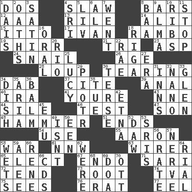 ACROSS 1. Two (Sp.) 4. Cole _ (cabbage dish) 8. Long, evenly shaped pieces 12. American Automobile Association (abbr.) 13. Cause heat under the collar 14. Set down 15. "Tell ____ the Marines!" 17. "Terrible" tsar 18. Role for Stallone 19. Bake eggs in their shells 21. Three (prefix) 23. Viper 24. Slow-paced one 26. Ripen 28. Central Nebraska county 30. Lacerating 34. Small moist lump or mass 37. Quote 39. Of or related to the anus 40. Retirement account (abbr.) 41. You are 43. Compass dir. 44. Filth; sediment 46. Trial 47. Boy, to dad 48. More overdramatic by comparison 51. Conclusions 54. Purpose 55. Composer Copland 58. Armed conflict 61. Compass dir. 63. One who wires 65. Choose 67. Inside; within (prefix) 71. Indian skirt 72. Watch over 73. Carrot, for example 74. Federal power corp. 75. Perceives with the eye 76. Part of Q.E.F. 77. Snakelike fish DOWN 1. Raised platform 2. Profane or obscene expressions 3. Smooth fabric 4. Indian title of respect (Mr.) 5. 54 in ancient Rome 6. Insect wing 7. Left 8. Sound made by sheep 9. _ mater 10. Chest bones 11. Constrict 16. Of the mouth 18. Port city in Latvia 20. _ de Janeiro 22. Actress Charlotte 25. "I Love _" 27. Period 29. Peter (Polish) 30. Laconic 31. Taverns 32. Billionth: prefix 33. Small, secluded valley 34. Food container 35. Roberta Peters solo 36. Lip ointment 38. Third day of the wk. 42. Inactive volcano in Sicily 45. Australian flightless bird 49. Is not 50. Car or cant ending 52. Obsolete 53. Indian titles of respect 56. Speak pompously 57. Effrontery 58. Soaks 59. Toward shelter 60. French philosopher Descartes 62. Past tense of be (plural) 64. Monetary unit of Yemen 66. Music discs 68. Not either 69. ___ good deed 70. Baseball player Mel