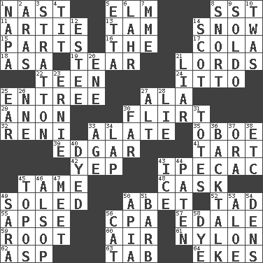 ACROSS 1. Political cartoonist Thomas 5. Shade tree 8. Fast jet (abbr.) 11. Nick name for Arthur 13. Scottish cap 14. Frozen precipitation 15. Actors' quests 16. Definite Article 17. Root beer relative 18. White ___ sheet 19. Pull into pieces 21. Nobles 22. Adolescent 24. "Tell ____ the Marines!" 25. Main course 27. Wing 29. At once, immediately (arch.) 30. Talk or behave amorously 32. Painter Guido (1575-1642) 33. Having winglike extensions 35. Mitch Miller's instrument 39. _ Allan Poe 41. Small pie 42. Slangy assent 43. Medicinal drug used to evoke vomiting 45. Docile 48. Keg 49. Having a sole or soles 50. Collude with 52. Small amount or degree 55. Domed church section 56. Numbers guy (abbr.) 57. Peak District village in England 59. Carrot, for example 60. Wind 61. Thermoplastic polyamide 62. Viper 63. Keyboard key 64. Makes supply last DOWN 1. California wine valley 2. Ancient river in northeast Turkey 3. Ski resort town in Vermont 4. Teat (slang) 5. Singer James 6. Cowardly lion portrayer 7. Madame (abbr.) 8. Derisive sound 9. Twentieth part of a lira 10. It was, poetically 12. First name in cosmetics 14. Native of Scotland 20. Compass dir. 21. One who doesn't tell the truth 23. Bert's buddy 25. Hearing organ 26. Compass dir. 27. The first octave above the treble staff 28. Falsehood 30. At a great distance 31. Hauls 33. Personal question 34. Pet locale 36. Sass 37. Mouth or opening 38. And so on (abbr.) 40. Colored 43. Frozen water 44. Eucharist need 45. Literary convention 46. Columnist Joseph or Stewart 47. Rendezvous 49. "Two Mules for Sister ____" 50. Capital of Western Samoa 51. Sharp remark 53. _ vera 54. Habitations of wild animals 56. Feline 58. Color