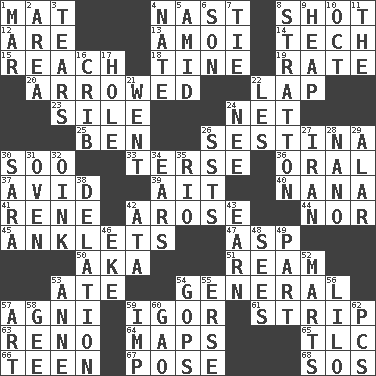 ACROSS 1. Floor protector 4. Political cartoonist Thomas 8. Went for two points 12. "We ___ not amused" (Victoria) 13. Mine, in Marseilles 14. Georgia ____ (Atlanta school) 15. Arrive at 18. Prong on a fork 19. Pace 20. Moved like an arrow 22. Pet locale 23. Drop; flow; fall 24. Fish or hair follower 25. Benjamin's nick name 26. French poetic form 30. "Barney Miller" actor Jack 33. Laconic 36. Spoken 37. Enthusiastic 39. Small island 40. Grandmother 41. French philosopher Descartes 42. Came up 44. Not either 45. Short socks 47. Viper 50. Alias (abbr.) 51. 480, 500 or 516 sheets of paper 53. Had dinner 54. Commissioned military rank 57. Hindu god of fire 59. Composer Stravinsky 61. Long narrow piece of something 63. Former U.S. Attorney General Janet 64. Atlas contents 65. Affectionate concern, for short 66. Adolescent 67. Introduce or present, as a question 68. Mayday DOWN 1. Spoil 2. Type of rug 3. Rends 4. Nathan's nickname 5. Among 6. Manchild 7. Standoff 8. Ski resort town in Vermont 9. Pile 10. Sep. follower 11. Definite Article 16. Baby bed with high sides 17. Hollow 21. Gone 22. French article 24. Born 26. Fast planes 27. SW Asia republic 28. Billionth: prefix 29. Having or resembling wings 30. "Two Mules for Sister ____" 31. Baking chamber 32. Pig sound 34. Hearing organs 35. River (Sp.) 38. Conveyance 42. "One Day ___ Time" 43. Merit 46. Make supply last 48. Observes 49. Role in a play 52. Shops 53. Queen of England 1702-14 54. Republicans 55. Celtic language 56. _ and Stitch 57. Tate display 58. Unit of force equal to gravity 59. Naughty child 60. E Mali city 62. Personal Computers (abbr.)