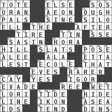 ACROSS 1. Lug 5. Otherwise 9. Distress signal 12. Northwest Algerian city 13. A really long time 14. Ending for "Through" and "Enough" 15. Friends 16. Trig term 17. Grain storage tower 18. Pipe bend 19. Definite Article 21. Following 22. Hoop that covers a wheel 24. Shallow baking pan 26. Compass dir. 27. Indian antelope 28. Israeli folk dance 29. Land elevation 30. Narrow boards 32. Airs 36. Toward shelter 37. Wing 38. Singer James 39. For fear that 40. Learning spot: Fr. 42. Not this but _ 43. Nights before holidays 44. Less widely known 46. Island 49. Consenting reply 50. Russian composer Stravinsky 51. Elude 53. Portuguese money of account (variant) 54. Dripping 57. Australian parrot (variant) 58. Event that recurs at intervals 61. Flintstone garb 62. Actor's bit 63. Picture 64. At sea 65. Begley and Asner 66. Look after 67. Lairs DOWN 1. Drink excessively 2. Spoken 3. Baron Munchausen's specialties 4. Followers of ems 5. Relaxation 6. Flowery wreath 7. Male child 8. Compass dir. 9. Costumes for special activities 10. Stares at amorously 11. Dinah or Pauly 14. Order of Saint Francis (abbr.) 19. Three (prefix) 20. Coop moms 21. Santa ___, CA 23. Small island 24. "_____ Recall" 25. Big collection agency 27. Drop; flow; fall 28. Rings 29. Actor Linden 31. Shoestrings 32. Stone: prefix 33. Else 34. Play the lead 35. Consume 40. Night before a holiday 41. 4th largest of the Great Lakes 43. Sight organ 45. Ripen 46. Cell (Danish) 47. Prevent from happening 48. Entertaining tales 52. Pass on 53. Tear apart 55. Genesis locale 56. Afternoon social gatherings 58. Teat (slang) 59. Mamie's husband 60. Spanish title 61. Possessed