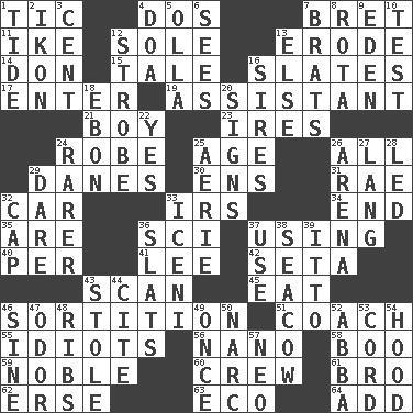 ACROSS 1. Nervous spasm 4. Two (Sp.) 7. Cy Young winner Saberhagen 11. Mamie's mate 12. Flatfish 13. Wear away 14. Spanish title 15. Lie 16. Chalkboards 17. Keyboard key 19. Aide 21. Male child 23. Angers 24. Loose flowing garment 25. Personal question 26. Everything 29. Natives or inhabitants of Denmark 30. Followers of ems 31. Actress Charlotte 32. 4-wheeled motor vehicle 33. Big collection agency 34. Conclude 35. "We ___ not amused" (Victoria) 36. _-fi 37. Putting into practice 40. For each 41. Area sheltered from the wind 42. Stalk of a moss capsule 43. Examine minutely or intensely 45. Erode 46. Decision 51. Team commander 55. Foolish or stupid persons 56. Billionth: prefix 58. Sometimes accompanies a hiss 59. Impressive in appearance 60. Group working together 61. Sis' sibling 62. Celtic language 63. Environmental prefix 64. Say or write further DOWN 1. Event that recurs at intervals 2. Picture 3. Penny 4. ___ good deed 5. Water jar 6. Observes 7. Naughty children 8. Round or rotation of duties 9. Genesis locale 10. Trial 12. Disco prop 13. Otherwise 16. Begets 18. Inky black, to poets 20. Public displays of written messages 22. Affirmative reply 24. Less widely known 25. Nest on high 26. Sports stadium 27. Long (Scottish) 28. Directed 29. Have the gumption 32. Head covering 33. Ancient Celtic tribe of eastern Britain 36. Narrow boards 37. Purpose 38. Manatee 39. "Tell ____ the Marines!" 43. Fur scarf 44. Quote 46. Trig term 47. Scent 48. Teases 49. At one time in the past 50. Drug cop 52. Swedish rock group 53. Drawstring 54. Parka part 57. Modern: prefix