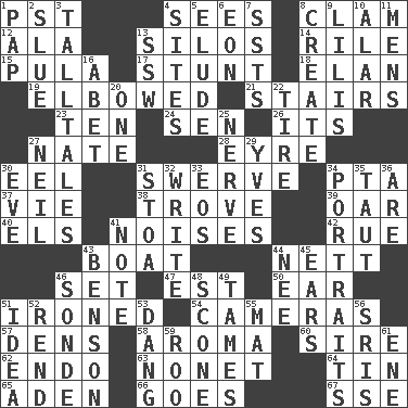 ACROSS 1. Pacific Standard Time (abbr.) 4. Observes 8. Dollar (slang) 12. In the manner of 13. Grain storage towers 14. Cause heat under the collar 15. Monetary unit of Botswana 17. Check the growth or development of 18. Liveliness 19. Turned at an angle; bent 21. Flight of steps 23. "___ Little Indians" 24. Elected rep. 26. It is 27. Nathan's nickname 28. Jane of fiction 30. Snakelike fish 31. Turn aside suddenly 34. Parent Teacher Assoc. 37. Compete 38. Collection of objects 39. Boat paddle 40. Raised railways 41. Annoying sounds 42. Regret 43. Water vessel 44. Remaining after all deductions 46. Put into a specified state 47. Eastern Standard Time (abbr.) 50. Hearing organ 51. Pressed 54. Devices for capturing images 57. Lairs 58. Scent 60. The founder of a family 62. Inside; within (prefix) 63. Music written for nine 64. Shallow baking pan 65. Arabian gulf 66. Travels 67. Compass dir. DOWN 1. Infant food 2. Turn sharply 3. Baron Munchausen's specialties 4. Settings 5. Evade 6. Period of immesurable duration 7. Fast planes 8. Cause to be 9. Ms. Damita and namesakes 10. Having or resembling wings 11. Not women's 13. Compass dir. 16. Collude with 20. Single 22. Hoop that covers a wheel 25. Impudent aggressiveness 27. Famous astronaut Armstrong 29. Jacques Cousteau's middle name 30. Night before a holiday 31. Portico 32. Compose 33. Greek goddess of the dawn 34. Likenesses of persons 35. Tense 36. "We ___ not amused" (Victoria) 41. Musical sound 43. Gillaume's butler role 44. Born 45. Hearing organs 46. Message 48. Biscuitlike quick bread 49. Softens 51. The content of cognition 52. Tear apart 53. Mild oath, euphamism for damn 55. Floor protector 56. Indian titles of respect 59. Friend of Pooh 61. Compass dir.