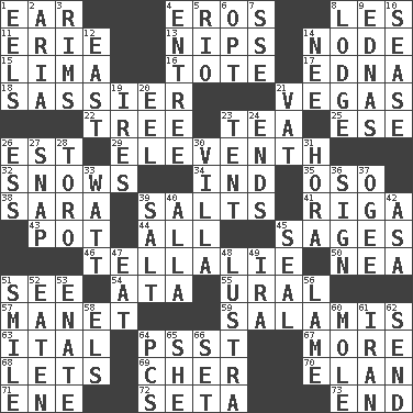 ACROSS 1. Hearing organ 4. Greek god of love 8. French article 11. 4th largest of the Great Lakes 13. Pinches, bites 14. Thickened enlargement 15. Pale green bean 16. Lug 17. Pulitzer Prize-winning author Ferber 18. More disrespectful 21. Viva Las _ 22. Family _ (genealogy) 23. Afternoon social gathering 25. Compass dir. 26. Eastern Standard Time (abbr.) 29. Veterans Day date 32. Overwhelms 34. Working for oneself (abbr.) 35. Bear (Spanish) 38. "Two Mules for Sister ____" 39. Table seasonings 41. Capital of Latvia 43. Cooking vessel 44. 100% 45. Gurus 46. Copy Pinocchio 50. Teachers' org. 51. Perceive with the eye 54. _ moment's notice (2 wds.) 55. Mountain range 57. French painter Edouard 59. Deli grouping 63. Slanted text style (abbr.) 64. Inconspicuous attention getter 67. Greater amount 68. Allows 69. "Mermaids" star 70. Liveliness 71. Compass dir. 72. Bristle 73. Conclusion DOWN 1. Snakelike fish 2. Roberta Peters solo 3. Basketball hoops 4. Main course 5. _ de Janeiro 6. Choose 7. Compass dir. 8. Cabin 9. Ferber et al. 10. Gospel singer Marvin 12. Compass direction 14. Born 19. Angers 20. Snakelike fish 21. Large container 23. Portable shelter 24. Extremities 26. Curvy letter 27. Fastener 28. "Corrida" creature 30. Country estate 31. Israeli folk dance 33. Electrical Unit 36. Signal 37. Double curve, resembling the letter S 39. Table seasoning 40. Silent film actress Nazimova 42. White ___ sheet 45. Lick closed 47. Consume 48. A period of five years 49. Lyricist Gershwin 51. Grin 52. Ingested 53. Maternal 56. Unable to walk 58. Raised railways 60. Undercover agent 61. SW Asia republic 62. Transmit 64. Personal Computers (abbr.) 65. A female animal or person 66. Put into a specified state