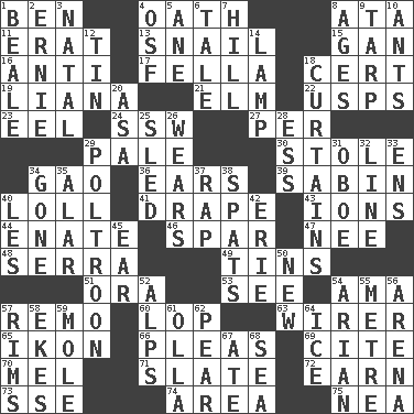 ACROSS 1. Benjamin's nick name 4. Pledge 8. _ moment's notice (2 wds.) 11. Part of Q.E.F. 13. Slow-paced one 15. Separate the seeds from cotton 16. Opposed to 17. Chap (slang) 18. Foregone conclusion 19. Woody, climbing, usually tropical plant 21. Shade tree 22. United States Postal Service (abbr.) 23. Snakelike fish 24. Compass dir. 27. For each 29. Diluted with white 30. Took without asking 34. E Mali city 36. Hearing organs 39. Unit of acoustic absorption 40. Hang loosely or laxly 41. Window treatment 43. Charged particles 44. Related on the mother's side 46. Practice fight 47. Born 48. Father Junipero _ 49. Airtight sealed metal containers 51. Mouth or opening 53. Perceive with the eye 54. Wet nurse (var.) 57. San ____ (Riviera town) 60. Trim (branches) 63. One who wires 65. Image 66. Entreaties 69. Quote 70. Cartoonist voice _ Blanc 71. Chalkboard 72. Merit 73. Compass dir. 74. Type of rug 75. Teachers' org. DOWN 1. Memphis, Tenn. Street 2. Bert's buddy 3. Brizilian seaport 4. Order of Saint Francis (abbr.) 5. One (Scot) 6. Lie 7. Land elevation 8. Eras 9. Canvas cover 10. Pismires 12. Shallow baking pan 14. Desk light 18. Window treatments 20. White ___ sheet 25. Downhill vehicle 26. Erodes 28. Curvy letter 29. Coward 31. Mitch Miller's instrument 32. Actor's bit 33. Followers of ems 34. Went 35. Having or resembling wings 37. Hit sharply and swiftly 38. Arguments over trivial matters 40. French article 42. 4th largest of the Great Lakes 45. Ewer handle 50. ___ Haven, CT 52. High mountains 54. Believer in; advocate of (suffix) 55. Distance measurement (Brit.) 56. Sports stadium 57. Basketball hoops 58. Supplements with great effort 59. Undercover agent 61. Rounded earthenware pot or jar 62. Lightbulb-shaped fruit 64. Frozen water 67. Had dinner 68. Ocean