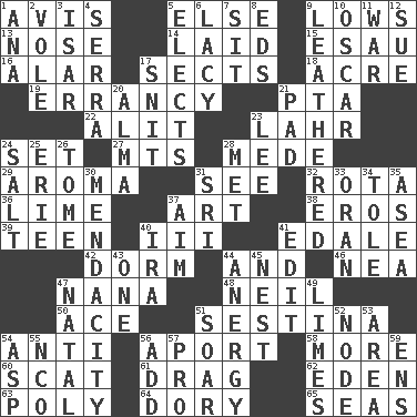 ACROSS 1. Advice 5. Otherwise 9. Moos 13. Characteristic smell of wine 14. Put down 15. He sold his birthright 16. Having or resembling wings 17. Religious groups 18. 1/640 square mile 19. The state or an instance of erring 21. Parent Teacher Association (abbr.) 22. Set down 23. Cowardly lion portrayer 24. Put into a specified state 27. Mountains (abbr.) 28. Ancient Persian 29. Scent 31. Perceive with the eye 32. Roll call or roster of names 36. Welles in "The Third Man" 37. Nonscientific branch of learning 38. Greek god of love 39. Adolescent 40. One more than two 41. Peak District village in England 42. Dormintory (informal) 44. Also 46. Teachers' org. 47. Grandmother 48. Famous astronaut Armstrong 50. Adept person 51. French poetic form 54. Opposed to 56. To the left, to Queeg 58. Greater amount 60. Get outta here! 61. To be drawn or hauled along 62. Locale of original sin 63. Many (prefix) 64. Small, narrow, flatbottom fishing boat 65. Oceans DOWN 1. Santa ___, CA 2. Grand slam 3. Austrian river, tributary to the Danube 4. Father Junipero _ 5. Opts 6. Made of lace 7. Be seated 8. Begley and Asner 9. Tough but pliablecoriaceous 10. Motion picture award 11. Armed conflict 12. Institute legal proceedings 17. In a ____ (agitated or irritated) 20. _ mater 21. Writing tablet 23. Area sheltered from the wind 24. Table seasoning 25. 4th largest of the Great Lakes 26. Heavy book 28. Was introduced to 30. Ananias' fault 31. Indian title of respect (Mr.) 33. Northwest Algerian city 34. Lacquered or enameled metalware 35. Toward the sea 37. Direct toward a target or goal 40. Lyricist Gershwin 41. Prepare for publication 43. Single 44. Disorder of the immune system 45. Egg locale 47. Brizilian seaport 49. Citrus fruits 51. Fly high 52. Connecting point 53. Length times width 54. Cleo's killer 55. Non-commissioned officer (abbr.) 56. Increase 57. Adept person 59. Followers of ems