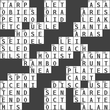 ACROSS 1. Canvas cover 5. Allow 8. White ___ sheet 11. Off-Broadway awards 13. Mouth or opening 14. Ancient Greek god of war 15. Stone: prefix 16. Hat (slang) 17. Path through which fluid escapes 18. And so on (abbr.) 19. Ubangi River tributary 21. Before Barbara or Clara 22. Stockings 24. Ancient river in northeast Turkey 25. A glass for beer 27. Luau accessory 29. Downhill vehicle 30. Arrive at 32. Otherwise 33. Wet 35. Hindu god of fire 39. Role for Stallone 41. The smallest animal of a litter 42. Teachers' org. 43. Food holders 45. Blemish 48. Draw slowly or heavily 49. Ancient Celtic tribe of eastern Britain 50. Flat circle 52. Purpose 55. Watch over 56. Elected rep. 57. Having ears or earlike features 59. Inside; within (prefix) 60. Sep. follower 61. Chalkboard 62. Mountains (abbr.) 63. Petroleum 64. Actor Alda or Thicke DOWN 1. Drink excessively 2. Collude with 3. Actors Guy, Robert Welles, and Clint 4. For each 5. Hang loosely or laxly 6. 4th largest of the Great Lakes 7. Small amount or degree 8. Sports stadium 9. Theater features 10. "____ silly question..." 12. Boozer 14. Having or resembling wings 20. Snakelike fish 21. Ketch in the Levant 23. More peculiar 25. Compass dir. 26. Pipe bend 27. French article 28. Ingest 30. _ de Janeiro 31. Ethiopian city, capital of Harari 33. Madame (abbr.) 34. Chief or king in Benin or Nigeria 36. From the throat 37. Compass dir. 38. ___ a Wonderful Life 40. Against 43. Personal Computers (abbr.) 44. Shoestrings 45. Aroma 46. Hangs 47. Southwest Nigerian state 49. A distinct part 50. Tenth: prefix 51. International (abbr.) 53. Stalk of a moss capsule 54. Paradise 56. "Barney Miller" actor Jack 58. In the manner of