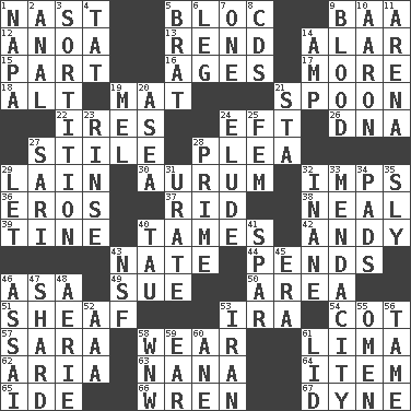 ACROSS 1. Political cartoonist Thomas 5. Coalition 9. Sound made by sheep 12. Small Philippine buffalo 13. Tear apart 14. Having or resembling wings 15. Role in a play 16. Eons 17. Greater amount 18. Keyboard modifier key 19. Floor protector 21. Soup utensil 22. Angers 24. Bank Draft (abbr.) 26. Heredity factor (abbr.) 27. Vertical member of a panel or frame 28. Entreaty 29. (Had) reclined 30. Gold (Symbol: Au) 32. Naughty children 36. Greek god of love 37. To free from 38. Actress Patricia 39. Prong on a fork 40. Softens 42. Actor Griffith 43. Nathan's nickname 44. Depends 46. White ___ sheet 49. Institute legal proceedings 50. Type of rug 51. To gather and bind into a bundle 53. Retirement account (abbr.) 54. Small bed 57. "Two Mules for Sister ____" 58. Erode 61. Pale green bean 62. Operatic vocal solo 63. Grandmother 64. A distinct part 65. Binary compound 66. Songbird 67. Unit of force DOWN 1. California wine valley 2. Of or related to the anus 3. Making a chance decision by using lots 4. Make lace 5. Naughty child 6. Part of a journey 7. Single 8. Music discs 9. Vital fluid 10. Composer Copland 11. Sports stadium 14. Electrical Unit 19. Cartoonist voice _ Blanc 20. At sea 21. R.R. building 23. Remove soap 24. Dodge 25. Opposite of masc. 27. Indian skirt 28. A-one 29. Allow 31. A salt of uric acid 32. Silly 33. Ananias' fault 34. Writing tablets 35. Wily 40. The 19th letter of the Greek alphabet 41. Coast Guard woman 43. Overdraft (abbr.) 45. Period 46. Slender Brazilian palm 47. Broken piece 48. Nest on high 52. American Automobile Association (abbr.) 53. SW Asia republic 55. Sign of something about to happen 56. Docile 58. Compass dir. 59. Ewer handle 60. One (Scot) 61. Hat (slang)