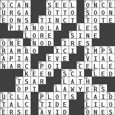 ACROSS 1. Skim 5. Stitch closed the eyes of (a falcon) 9. At one time in the past 13. Capital and largest city of Mongolia 14. Von Bismarck 15. Within a short period 16. Immeasurably long periods of time 17. Colored lightly or faintly 18. Carry 19. Player piano 21. French article 22. Old wives' tales, e.g. 23. Trig term 24. Single 27. Lower and raise head in agreement 28. Angers 29. Role for Stallone 31. One more than ninety 32. Naughty children 36. Capital of Western Samoa 37. First lady 38. Small bottle 39. Drug cop 40. Luau course 41. Cell (Danish) 42. Peachy ____! 44. _-fi 46. Directed 47. Russian ruler of old 48. Thin strip of wood or metal 50. Choose 51. Those who practice law 54. Southern CA. univ. 56. Secret plans 58. Put down 60. Baby powder 61. Event that recurs at intervals 62. _ and Stitch 63. Celtic language 64. Enthusiastic 65. Singles DOWN 1. Take to court 2. Riding implement 3. Hindu god of fire 4. Rhinal 5. Dirtied 6. Inactive volcano in Sicily 7. And so on (abbr.) 8. Car dealer's back yard 9. Clearly or manifestly demonstrative 10. Trap for birds or small mammals 11. Small bed 12. Compass dir. 17. "Corrida" creature 20. Words to Nanette 21. Falsehood 23. _ Lanka 24. Northwest Algerian city 25. California wine valley 26. Arab leader 28. Frozen water 30. Keyboard key 31. 16 33. Place where flour is made 34. Light colored 35. Downhill vehicle 37. Age 40. For each 41. Municipality 43. Erode 44. Scheduled 45. Crow sounds 47. For Whom the Bell _____ 49. Phone greeting 51. Farming town in central California 52. Water falling in drops from the sky 53. Filth; sediment 54. Shoshoni 55. Automobile 56. Parent Teacher Association (abbr.) 57. 54 in ancient Rome 59. Two (Sp.)