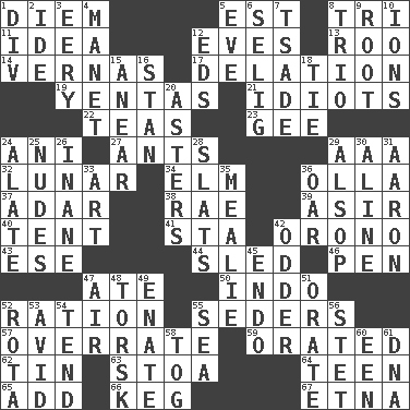 ACROSS 1. South Vietnam president (1954) 5. Eastern Standard Time (abbr.) 8. Three (prefix) 11. The main thing one is thinking about 12. Nights before holidays 13. Friend of Pooh 14. Actresses Bloom and Felton 17. Accusation by an informer 19. Gossips 21. Foolish or stupid persons 22. Afternoon social gatherings 23. Turn to the right 24. Black tropical American cuckoo 27. Pismires 29. American Automobile Association (abbr.) 32. Type of eclipse 34. Shade tree 36. Rounded earthenware pot or jar 37. The sixth month of the Jewish calendar 38. Actress Charlotte 39. SW Saudi Arabia district 40. Portable shelter 41. R.R. building 42. U. of Maine site 43. Compass dir. 44. Downhill vehicle 46. Animal enclosure 47. Had dinner 50. Southeast Asian peninsula 52. Food allowance for one day 55. Spring feasts 57. Make much ado about nothing 59. Declaimed 62. Metal container 63. Portico 64. Adolescent 65. Increase 66. Barrel 67. Inactive volcano in Sicily DOWN 1. HTML Container Element 2. Binary compound 3. Suggestive of the supernatural 4. French painter Edouard 5. First lady 6. Major League Baseball Commissioner Bud 7. Sadhe (variant) 8. Musical group of three 9. Carrot, for example 10. Charged particles 12. Begley and Asner 15. Approach 16. Comedian Laurel of Laurel & Hardy 18. Make a knot 20. Michaelmas daisies 24. Having winglike extensions 25. Unclothed pictures 26. Lacking in sense or substance 28. Narrow boards 29. Columnist Joseph or Stewart 30. Place in a line 31. Composer Copland 33. Nonscientific branch of learning 35. Ear of corn 36. Rowing implement 42. More peculiar 45. Inside; within (prefix) 47. Wind 48. Cod relative 49. Related on the mother's side 51. Speak pompously 52. Round or rotation of duties 53. Enthusiastic 54. Look after 55. Ocean 56. Proofreading order 58. Coat; cloak 60. Car or cant ending 61. Heredity factor (abbr.)