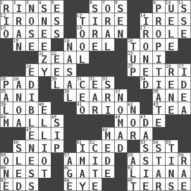 ACROSS 1. Remove soap 6. Distress signal 9. Purulenc 12. Metal shackles 13. Hoop that covers a wheel 14. Angers 15. Fertile tracts in a desert 16. Northwest Algerian city 17. Hero or heavy, e.g. 18. Born 19. Christmas carol 20. Drink excessively 21. Ardor 23. Corn or form start 24. Snake ____ (dice throw) 25. _ dish (used to culture cells) 28. Writing tablet 30. Shoestrings 34. Passed on 35. Black tropical American cuckoo 36. Acquire or gain knowledge or skills 38. One (Scot) 39. Ear part 41. Constellation of myth 43. Beverage made from leaves 44. Promenades 46. Method 48. Biblical high priest 49. Hindu Mythology: god of death 50. Sever or remove by pinching or nipping 51. On the rocks 53. Fast jet (abbr.) 56. Margarine 57. Among 58. Being in motion 60. A home for chicks 61. Yard entry 62. Woody, climbing, usually tropical plant 63. Begley and Asner 64. Sight organ 65. Laconic DOWN 1. _ de Janeiro 2. SW Asia republic 3. Olfactory organ 4. Dwarf with a sinus problem 5. Curvy letter 6. Male parent of an animal 7. Of the mouth 8. Elected rep. 9. Appease 10. Ubangi River tributary 11. Compass dir. 13. Utensil 14. Pressed 19. Relating to the nose 20. Uncastrated adult male sheep 22. Snakelike fish 24. The property of being fit to eat 26. French philosopher Descartes 27. The content of cognition 28. Inside of hand 29. Small Philippine buffalo 31. Corporate head (abbr.) 32. Ewer handle 33. Indian title of respect (Mr.) 37. Wanderer 40. American author Paul (1891-1958) 42. Not either 45. Small drink 47. Hyrax 49. Ancient Persian 50. Downhill vehicle 51. "If ____ say so..." 52. Quote 54. Play the lead 55. Canisters 56. Single 57. Personal question 58. The first octave above the treble staff 59. Actress Charlotte