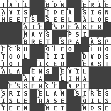 ACROSS 1. Jacques of French films 5. Arrow shooter 8. One of the Great Lakes 12. Opinion 13. The content of cognition 15. Signal 16. Confronts 18. Stitch closed the eyes of (a falcon) 19. _ vera 20. Had dinner 22. Orator 24. Negative votes 26. Air pressure measure (abbr.) 27. Cy Young winner Saberhagen 28. Health resort 29. Viper 32. Shade of tan 35. Butter sub 37. Nilotic language 38. Implement 39. One more than two 40. Movie discs 41. Small child 42. On the rocks 43. Compass direction 44. Chicken ___ king 45. Followers of ems 46. Tending to cause great harm 49. Actress Gardner 50. Pale green bean 51. Gist 55. Fitting 56. Indian titles of respect 57. Style 59. Titles for men of rank and authority 63. Small island 64. Raze (variant) 65. Petroleums 66. Adolescent 67. Was introduced to 68. Characteristic smell of wine DOWN 1. Scottish cap 2. "___ Maria" 3. Neckwear 4. Byzantium, centuries later 5. Twice 6. Lyric poems 7. Shed a tear 8. 1973 Nobel Price Winner (Physics) Leo 9. Cause heat under the collar 10. Composer Stravinsky 11. Compass dir. 14. City in Syria 17. Play the lead 21. Sight organ 23. White ___ sheet 25. Unemotional ones 28. Beer mug 29. Inventor's middle name 30. Beer foam 31. Mail 32. Singer James 33. Calm and collected 34. Roll call or roster of names 36. Untruth 40. Accusation by an informer 42. More lacking in sense or substance 45. First lady 47. By way of 48. Naughty children 49. NE Netherlands city 51. Celtic language 52. Filth; sediment 53. Burrowing marine mollusk 54. Comfort 56. Be seated 58. Fish or hair follower 60. _ de Janeiro 61. Raised railways 62. Compass dir.