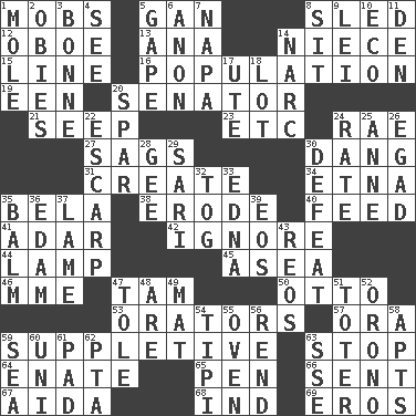 ACROSS 1. Crowds into 5. Separate the seeds from cotton 8. Downhill vehicle 12. Mitch Miller's instrument 13. Santa ___, CA 14. Sibling's daughter 15. Actor's bit 16. Census information 19. Car or cant ending 20. Legislator 21. Ooze 23. And so on (abbr.) 24. Actress Charlotte 27. Settles 30. Mild oath, euphamism for damn 31. Make 34. Inactive volcano in Sicily 35. Actor Lugosi 38. Eat (away) 40. Nourish 41. The sixth month of the Jewish calendar 42. Dismiss 44. Desk light 45. At sea 46. Madame (abbr.) 47. Scottish cap 50. Von Bismarck 53. Speakers 57. Mouth or opening 59. Supplementary 63. Halt 64. Related on the mother's side 65. Fenced enclosure 66. Transmitted 67. Opera by Verdi 68. Indiana (abbr.) 69. Greek god of love DOWN 1. Undercover agent 2. Off-Broadway awards 3. Maid-servant 4. Observe 5. Yawn 6. At once, immediately (arch.) 7. California wine valley 8. Be seated 9. Flowery wreath 10. Environmental prefix 11. Lair 14. Drug cop 17. Shoshoni 18. Car dealer's back yard 20. Coast Guard woman 22. Fortification 24. Assign a rank or rating to 25. Singer Murray 26. Mild oath 28. Unit of force equal to gravity 29. Indian skirt 30. Outscore 32. Coat; cloak 33. Pulitzer Prize-winning author Ferber 35. Lip ointment 36. Dutch treat 37. Unable to walk 39. Greek goddess of the dawn 43. Vintage cars 47. Lacquered or enameled metalware 48. "We ___ not amused" (Victoria) 49. Floor covering 51. Carrier 52. U. of Maine site 54. Native american tent (variation) 55. Baking chamber 56. Tear apart 58. Tenement units (abbr.) 59. Ocean 60. Single; one (prefix) 61. Writing tablet 62. Parent Teacher Assoc. 63. Compass dir.