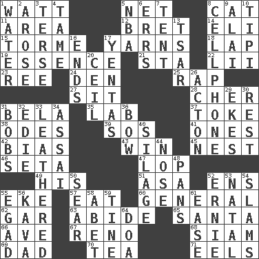 ACROSS 1. Electrical Unit 5. Fish or hair follower 8. Feline 11. Length times width 12. Cy Young winner Saberhagen 14. Connecticut Ivy Leaguer 15. Singer Mel 17. Entertaining tales 18. Pet locale 19. Core 21. R.R. building 22. Cards in a Roman deck? 23. Portuguese money of account (variant) 24. Lair 25. Strike 27. Be seated 28. "Mermaids" star 31. Actor Lugosi 35. Experiment locale 37. Puff or smoke 38. Lyric poems 39. Mayday 41. Washington bills 42. Prejudice 43. Victory 45. A home for chicks 46. Bristle 47. Trim (branches) 49. Part of HMS, perhaps 51. White ___ sheet 52. Followers of ems 55. Supplement with great effort 57. Erode 60. Commissioned military rank 62. Slender fish 63. Stay 65. Before Barbara or Clara 66. "___ Maria" 67. Former U.S. Attorney General Janet 68. Thailand, formerly 69. June honoree 70. Beverage made from leaves 71. Snakelike fish DOWN 1. Wetness 2. Came up 3. Laconic 4. Not wild 5. Basketball assoc. 6. Blunders 7. Portable shelter 8. Portable communications device 9. Mountain range southwest of Kyrgyzstan 10. Native american tent (variation) 13. Russian ruler of old 16. Conclusions 17. Gossips 20. To provide with a ceiling 26. 13-14th century defensive garment 29. Makes supply last 30. Repose 31. Moves up and down 32. Singer Brickell 33. Resembling or made to resemble leather 34. Slender Brazilian palm 36. Arrow shooter 40. Fodder prepared in a silo 44. Olfactory organ 48. Baking dishes 50. Scorch 52. Bert's buddy 53. Relating to or accompanying birth 54. Hits or strikes with great force 55. Mild oath 56. Polynesian shrub of the pepper family 58. Collude with 59. Prong on a fork 61. Relaxation 64. ___ good deed