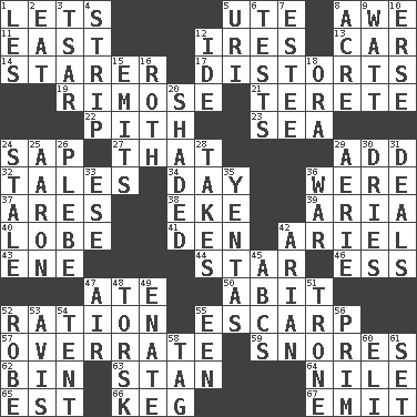 ACROSS 1. Allows 5. Shoshoni 8. Deep reverence 11. Compass direction 12. Angers 13. Auto 14. A viewer who gazes fixedly 17. What propaganda does 19. Full of chinks, cracks, or crevices 21. Cigar-shaped 22. Heart or essence 23. Ocean 24. Plant excrement 27. Not this but _ 29. Increase 32. Stories 34. 24 hours 36. We are 37. Ancient Greek god of war 38. Supplement with great effort 39. Roberta Peters solo 40. Ear part 41. Lair 42. Satellite of Uranus 43. Compass dir. 44. Play the lead 46. Curvy letter 47. Had dinner 50. "This won't hurt ____!" 52. Food allowance for one day 55. Fortification 57. Make much ado about nothing 59. Sounds asleep 62. Storage container 63. Comedian Laurel of Laurel & Hardy 64. The longest river in the world 65. Eastern Standard Time (abbr.) 66. Barrel 67. Send forth DOWN 1. French article 2. Erode 3. Russian ruler of old 4. Remove all contents or possession from 5. RI univ. 6. Trials 7. First name in cosmetics 8. Measure of real estate 9. Electrical Unit 10. Celtic language 12. Binary compound 15. Gives off 16. Writer of Portnoy's Complaint (1969) 18. Mouth or opening 20. Cast a shadow over 24. Having lost freshness 25. Composer Copland 26. Military trainee 28. Receives possession of 29. Nest on high 30. Frees from moisture 31. Allots cards 33. Compass dir. 35. Gossips 36. Armed conflict 42. Believer in; advocate of (suffix) 45. Lettered men learn these first 47. Atmosphere 48. Cod relative 49. Maternal 51. Marketplace scale 52. Loose flowing garment 53. Deliberation 54. Portable shelter 55. Car or cant ending 56. Demure 58. Label 60. Connecticut Ivy Leaguer 61. Arrange properly for use