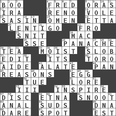 ACROSS 1. Oct. 31 cry 4. Flintstone 8. Mouths or openings 12. Retirement account (abbr.) 13. Former U.S. Attorney General Janet 14. Grand slam 15. Indian antelope 18. Sign of something about to happen 19. Singer James 20. Small, flat, pigmented spot on the skin 22. From 23. In a ____ (agitated or irritated) 24. Apple computer (short form) 25. Compass dir. 26. Flamboyance 30. Beverage made from leaves 33. Wet 36. Oscar Madison type 37. Prepare for publication 39. It is 40. "Corrida" creature 41. Assistant 42. Having winglike extensions 44. Baking dish 45. Thinks logically 47. Oval reproductive body of a fowl 50. Third day of the wk. 51. Old wives' tales, e.g. 53. One more than two 54. Heighten or intensify 57. Flat circle 59. Inactive volcano in Sicily 61. Snob 63. Of or related to the anus 64. Beer foam 65. Heredity factor (abbr.) 66. Have the gumption 67. Blemish 68. Eastern Standard Time (abbr.) DOWN 1. Again 2. Taken by mouth 3. Fertile tracts in a desert 4. Toadlike animal 5. San ____ (Riviera town) 6. Compass dir. 7. Spanish title 8. Cloudy 9. Printing process, for short 10. Keyboard modifier key 11. Ocean 16. Taverns 17. Nuclear Threat Initiatives 21. A whole individual unit 22. Air blower 24. Floor protector 26. Inconspicuous attention getter 27. Hoof sound 28. Israeli folk dance 29. Inky black, to poets 30. Pull apart 31. Singer Brickell 32. Opera by Verdi 34. Lubricates 35. Call ___ day 38. One of the two male reproductive glands 42. One (Scot) 43. Snakelike fish 46. Fr. "Yes" 48. Republicans 49. Amused look 52. Eat (away) 53. Austrian river, tributary to the Danube 54. _ china 55. Political cartoonist Thomas 56. Immeasurably long periods of time 57. Male parent 58. _ tizzy (2 wds.) 59. Double-curved letter 60. Uncastrated adult male sheep 62. Make lace