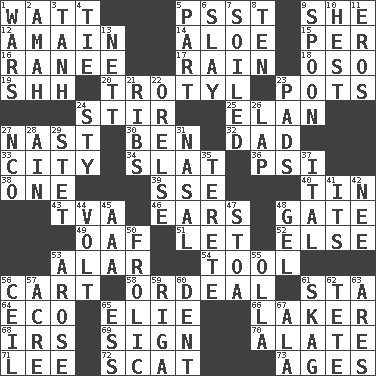 ACROSS 1. Electrical Unit 5. Inconspicuous attention getter 9. A female animal or person 12. At full speed 14. Medicinal plant 15. For each 16. Indian princess (variant) 17. Water falling in drops from the sky 18. Bear (Spanish) 19. Quiet! 20. Trinitrotoluene 23. Plant holders 24. Move through with a circular motion 25. Style 27. Political cartoonist Thomas 30. Benjamin's nick name 32. Male parent 33. Municipality 34. Narrow board 36. 23rd letter of the Greek alphabet 38. Single 39. Compass dir. 40. Metal container 43. Federal power corp. 46. Hearing organs 48. Yard entry 49. Clumsy lout 51. Allow 52. Otherwise 53. Having or resembling wings 54. Implement 56. Haul 58. Severe or trying experience 61. R.R. building 64. Environmental prefix 65. Writer Wiesel 66. Member of a famous L.A. basketball team 68. Big collection agency 69. Signal 70. Having winglike extensions 71. Area sheltered from the wind 72. Go away! 73. Eras DOWN 1. Armed conflicts 2. Housemaid 3. Hyperbolic tangent 4. Neckwear 5. Role in a play 6. Kill 7. Dirtied 8. Nine, plus one 9. Soup utensil 10. Command 11. Greek god of love 13. Remaining after all deductions 21. Chest bones 22. Threatening words 23. Writing tablets 24. Filthy place 26. Pet locale 27. Non-commissioned officer (abbr.) 28. The 18th letter of the Arabic alphabet 29. Proofreading order 31. Relating to the nose 35. Cylindrical with tapered ends 37. Slanted text style (abbr.) 41. ___ a Wonderful Life 42. Born 44. Electrical Unit 45. American Automobile Association (abbr.) 47. Portico 48. Set 50. Play 53. Came up 55. Rounded earthenware pot or jar 56. To provide with a ceiling 57. 1/640 square mile 59. Port city in Latvia 60. Incision 61. Heroin 62. Wig 63. Ancient Greek god of war 65. Double-curved letter 67. Insect wing