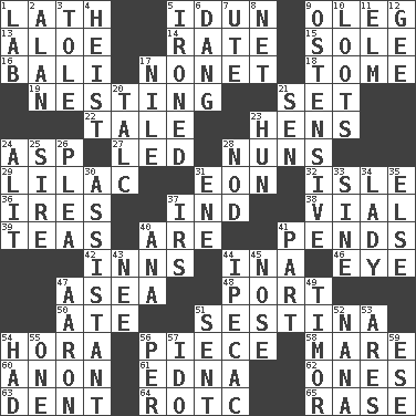 ACROSS 1. Thin strip of wood or metal 5. Goddess of spring and wife of Bragi 9. Cassini of fashion 13. _ vera 14. Pace 15. Flatfish 16. Indonesian resort city 17. Music written for nine 18. Heavy book 19. Snuggling 21. Put into a specified state 22. Falsehood 23. Coop moms 24. Cleo's killer 27. Directed 28. Religious women 29. Pale purple color 31. A really long time 32. Small island 36. Angers 37. Indiana (abbr.) 38. Small bottle 39. Afternoon social gatherings 40. "We ___ not amused" (Victoria) 41. Hangs 42. Taverns 44. _ tizzy (2 wds.) 46. Sight organ 47. Toward the sea 48. Left side of a ship or aircraft 50. Had dinner 51. French poetic form 54. Israeli folk dance 56. Part 58. Female horse 60. Soon (poet.) 61. Pulitzer Prize-winning author Ferber 62. Singles 63. Incision 64. College mil. group 65. To erase DOWN 1. Experiment locale 2. ____ Jay Lerner 3. Lacquered or enameled metalware 4. Robbery 5. Pressed 6. Mild oath, euphamism for damn 7. Shoshoni 8. Fish or hair follower 9. Clearly or manifestly demonstrative 10. Plunders 11. Shade tree 12. Turn to the right 17. The longest river in the world 20. Baby powder 21. Elected rep. 23. Attila the _ 24. Set down 25. The founder of a family 26. Entreaty 28. Allow head to fall sleepily 30. Aide 31. Compass dir. 33. Trig term 34. Kenny Rogers chart-topper in '80 35. Otherwise 37. Big collection agency 40. Santa ___, CA 41. Role in a play 43. Born 44. Medicinal drug used to evoke vomiting 45. Sense of smell 47. Composer Copland 49. The easternmost of the Lesser Sundas 51. Posted 52. Nanny 53. Ancient Greek god of war 54. Possessed 55. Single 56. For each 57. Wedding promise 59. Compass dir.