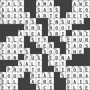 ACROSS 1. Diluted with white 5. Nursemaid (var.) 8. Deep reverence 11. Having or resembling wings 12. Backtalk 14. Lion 15. Annoying sound 17. Johnson of "Laugh-In" 18. Stakes 19. Spring feasts 21. Follows as a consequence or result 23. 17th letter of the Greek alphabet 25. Carrot, for example 26. At sea 27. Indian title of respect (Mr.) 28. Black tropical American cuckoo 31. Affectionate concern, for short 33. Filthy place 35. Arboreal primate 37. "Silly old bear" 38. Layer 40. Small boys 41. Trading vessels 43. "Barney Miller" actor Jack 45. Definite Article 46. Boy, to dad 47. Fluid product of inflammation 50. Pulitzer Prize-winning author Ferber 52. Table seasoning 53. Allow 54. Right away 56. Full of chinks, cracks, or crevices 61. Good sense 62. Monetary unit of Yemen 65. Spanish missionary in California 66. Pipe bend 67. 1/640 square mile 68. Raised platform 69. Sight organ 70. _-fi 71. Otherwise DOWN 1. Zero-star reviews 2. _ vera 3. Put down 4. Celtic language 5. White ___ sheet 6. Third mo. 7. Michaelmas daisies 8. Toward shelter 9. Moistens 10. Greek goddess of the dawn 13. Sir (Sp.) 16. Blunders 18. With the exception that 20. "______ My Girl" (Turtles hit) 22. Earth 24. Pledge 26. Painful 28. Wet nurse 29. Unadorned 30. Big collection agency 31. "Corrida" creature 32. Grant temporary use of 34. Consenting reply 36. Singer James 37. Personal Computers (abbr.) 39. Christmas carol 42. Connect, as a bridge 44. Baltic tributary 48. Extremist 49. Unemotional ones 51. Nuclear Threat Initiatives 52. Distress signal 54. Many (prefix) 55. Court order 57. Ancient Persian 58. Relating to the mouth 59. Indian titles of respect 60. Comfort 61. Born 63. Curve 64. Luau accessory