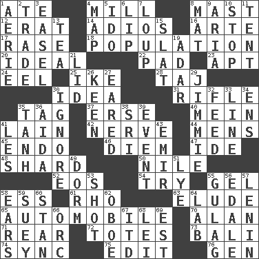 ACROSS 1. Had dinner 4. Place where flour is made 8. Vertical spar for supporting sails 12. Part of Q.E.F. 14. Goodbye (Sp.) 16. Johnson of "Laugh-In" 17. Raze (variant) 18. Census information 20. Perfect 22. Groovy apt. 23. Fitting 24. Snakelike fish 25. Mamie's husband 28. _ Mahal 30. The main thing one is thinking about 31. Ransack; plunder; pillage 35. Label 37. Celtic language 40. Count _ (2 wds.) 41. (Had) reclined 42. Boldness 44. Not women's 45. Inside; within (prefix) 46. South Vietnam president (1954) 47. Binary compound 48. Pottery fragment 50. "Death on the ____" 52. Greek goddess of the dawn 54. Attempt 55. Set 58. Double-curved letter 61. 17th letter of the Greek alphabet 63. Evade 65. Form of transportation 70. Actor Alda or Thicke 71. Located in or toward the back 72. Lugs 73. Indonesian resort city 74. Synchronize (abbr.) 75. Prepare for publication 76. Commissioned mil. rank DOWN 1. Nest on high 2. Barter 3. Artist's stand 4. Atlas unit 5. Wedding promise 6. Mouth edge 7. Central Nebraska county 8. Floor covering 9. Roberta Peters solo 10. Cease 11. Portable shelter 13. Afternoon social gathering 15. Narrow board 19. The sixth month of the Jewish calendar 21. Hat (slang) 26. Peachy ____! 27. Having ears or earlike features 29. Stevie Ray Vaughan's brother 30. Disregard 32. Nourish 33. Actor's bit 34. Followers of ems 35. Hyperbolic tangent 36. Opera by Verdi 38. _ Lanka 39. Incident 41. French article 43. Independent ruler or chieftain 49. Dormintory (informal) 51. Potassium hydroxide 53. Guess 55. POW camp 56. Peak District village in England 57. Soviet premier 1918-24 58. Hearing organs 59. Chop _ 60. Comedian Laurel of Laurel & Hardy 62. Mitch Miller's instrument 64. Experiment locale 66. The grampus (Milton) 67. It would 68. Luau accessory 69. Eastern Standard Time (abbr.)
