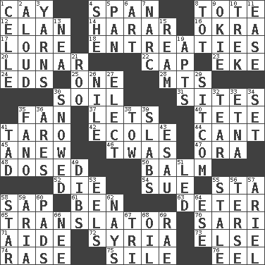 ACROSS 1. Island 4. Connect, as a bridge 8. Haul 12. Flair 14. Ethiopian city, capital of Harari 16. Gumbo ingredient 17. Old wives' tales, e.g. 18. Pleas 20. Type of eclipse 22. Head covering 23. Make supply last 24. Begley and Asner 25. Single 28. Mountains (abbr.) 30. Earth 31. Locates 35. Avid follower 37. Allows 40. False hair 41. Pacific island yam 42. Learning spot: Fr. 44. Patter 45. Afresh 46. It was, poetically 47. Mouth or opening 48. Administered medicine 50. Lip ointment 52. Expire 54. Take to court 55. R.R. building 58. Plant excrement 61. Benjamin's nick name 63. Prevent from occurring 65. Interpreter 70. Indian skirt 71. Helper 72. Damascus' land 73. Otherwise 74. To erase 75. Drop; flow; fall 76. Snakelike fish DOWN 1. Cell (Danish) 2. Verbally 3. Entertaining tales 4. A female animal or person 5. Baking dish 6. Tate display 7. Drug cop 8. Small child 9. Migrant worker of the '30s 10. Long journey 11. Comfort 13. Teachers' org. 15. 480, 500 or 516 sheets of paper 19. Tenement units (abbr.) 21. Friend of Pooh 26. The longest river in the world 27. Voters do this 29. "Cheers" or "Ellen" 30. Frozen precipiation fell 32. Lacerate 33. Inactive volcano in Sicily 34. Put into a specified state 35. Papal veil 36. Ancient Greek god of war 38. Pull behind 39. Thick slices 41. Small boy 43. He sold his birthright 49. Rights 51. Directed 53. Snakelike fish 55. Having lost freshness 56. Laconic 57. Satellite of Uranus 58. Play the lead 59. Operatic vocal solo 60. Groovy apts. 62. Negative votes 64. Compass dir. 66. Born 67. Three (prefix) 68. Petroleum 69. Actress Charlotte