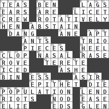 ACROSS 1. Afternoon social gatherings 5. Benjamin's nick name 8. Straggles 12. Hearing organs 13. "We ___ not amused" (Victoria) 14. It is permitted: Lat. 15. Group working together 16. Rotating or pertaining to rotation 19. Layer 20. Refrain by choice 21. Mild oath, euphamism for damn 23. A saturated hydrocarbon 24. Fitting 27. Pismires 30. Musical group of three 31. Parts 34. Person who is morally reprehensible 35. Hoof sound 38. Rhinal 40. To erase 41. Be footloose 42. Cigar-shaped 44. On the rocks 45. American tennis player Robert 46. Storage container 47. Curvy letter 50. SW Saudi Arabia district 53. Curse 57. Pass on 59. Census information 63. Grant temporary use of 64. Disturbances 65. Dreamland 66. Comfort 67. Writer Wiesel 68. Begley and Asner 69. Small, secluded valley DOWN 1. Technical 2. Having ears or earlike features 3. Sports stadium 4. Compass dir. 5. Sharp remark 6. Greek god of love 7. Remaining after all deductions 8. 54 in ancient Rome 9. Adept person 10. Set 11. Filthy place 14. Actor's bit 17. Auto club (abbr.) 18. Shallow baking pan 20. Hindu god of fire 22. Slept 24. Length times width 25. Sliced desserts 26. Lacquered or enameled metalware 28. "___ Little Indians" 29. Scram, to a cat 30. Threesomes 32. Compass dir. 33. "Two Mules for Sister ____" 35. Baby bed with high sides 36. Event scenes 37. Baking chamber 39. French article 43. Not this but _ 47. Snakelike fish 48. Health resort 49. Be seated 51. Perfect 52. Wash lightly 54. Prong on a fork 55. Parka part 56. Conclusions 58. Paradise 59. Before (prefix) 60. Lubricate 61. Luau course 62. Shoshoni 63. Part of a journey
