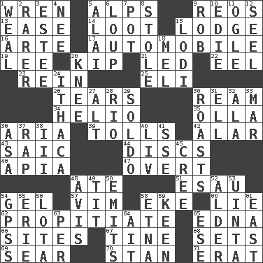 ACROSS 1. Songbird 5. High mountains 9. Vintage cars 13. Comfort 14. Spoils 15. Cabin 16. Johnson of "Laugh-In" 17. Car 19. Area sheltered from the wind 20. Monetary unit of Laos 21. Directed 22. Snakelike fish 23. It's straight from the horse's mouth 25. Connecticut Ivy Leaguer 26. Pulls apart 30. 480, 500 or 516 sheets of paper 34. Sun: prefix 35. Rounded earthenware pot or jar 36. Operatic vocal solo 39. For Whom the Bell _____ 42. Having or resembling wings 43. Ketch in the Levant 44. Plates 46. Capital of Western Samoa 47. Unconcealed 48. Had dinner 51. He sold his birthright 54. Set 57. Zeal 58. Make supply last 60. Untruth 62. Appease 65. Pulitzer Prize-winning author Ferber 66. Locates 67. Prong on a fork 68. Arranges properly for use 69. Burn superficially 70. Comedian Laurel of Laurel & Hardy 71. Part of Q.E.F. DOWN 1. Welt 2. More uncommon 3. First name in cosmetics 4. Born 5. Jai _ 6. Central Nebraska county 7. Cooking vessel 8. Fur scarf 9. Director Reiner 10. Singer Brickell 11. Stare at amorously 12. Stitch closed the eyes of (a falcon) 15. Farming town in central California 18. Cartoonist voice _ Blanc 20. Leg joint 24. New York city 27. The first octave above the treble staff 28. _ de Janeiro 29. Twentieth part of a lira 30. Ridicules or criticizes harshly 31. Pipe bend 32. In the manner of 33. Spoil 36. White ___ sheet 37. Hit sharply and swiftly 38. One more than two 40. 54 in ancient Rome 41. Compass dir. 45. Algonquian 48. Opinion 49. Teat (slang) 50. Sends forth 52. Tree or shrub in the Birch family 53. National forest in Provo, Utah 54. Global Positioning Systems (abbr.) 55. One of the Great Lakes 56. Globular water bottle used in Asia 58. Inactive volcano in Sicily 59. Peachy ____! 61. Compass direction 63. For each 64. Small island 65. Compass dir.