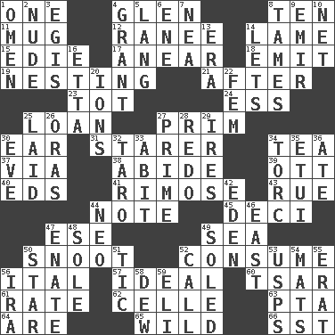 ACROSS 1. Single 4. Small, secluded valley 8. "___ Little Indians" 11. Large cup 12. Indian princess (variant) 14. Unable to walk 15. Singer Brickell 17. Approach 18. Give off 19. Inhabiting a nest 21. Following 23. Small child 24. Curvy letter 25. Grant temporary use of 27. Demure 30. Hearing organ 31. A viewer who gazes fixedly 34. Beverage made from leaves 37. By way of 38. Stay 39. Baseball player Mel 40. Begley and Asner 41. Full of chinks, cracks, or crevices 43. Regret 44. Brief written record 45. Tenth: prefix 47. Compass dir. 49. Ocean 50. Snob 52. Eat 56. Slanted text style (abbr.) 57. Standard of perfection 60. Russian ruler of old 61. Assign a rank or rating to 62. Cell (Danish) 63. Parent Teacher Association (abbr.) 64. "We ___ not amused" (Victoria) 65. Uncontrolled 66. Fast jet (abbr.) DOWN 1. Sign of things to come 2. Unadorned 3. Armor plate that protects the chest 4. Let have 5. Long (Scottish) 6. Compass dir. 7. Teachers' org. 8. Corrects by punishment or discipline 9. Arab leader 10. Fish or hair follower 13. Period 14. Allows 16. Singer James 20. Charged atoms 22. Opposite of masc. 25. Put down 26. Mouths or openings 27. First class 28. Do over again 29. Angers 30. Night before a holiday 32. Edible starchy tuberous root 33. "This won't hurt ____!" 34. Torque (variant) 35. Needle case 36. Had dinner 42. Locale of original sin 44. Modern: prefix 46. Compass direction 47. Related on the mother's side 48. Not divided or shared with others 49. Having a sole or soles 50. Play the lead 51. Nervous spasm 52. Give a ring to 53. United States Postal Service (abbr.) 54. Floor coverings 55. Part of Q.E.F. 56. Lyricist Gershwin 58. Morning condensation 59. Connecticut Ivy Leaguer