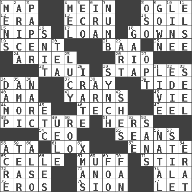 ACROSS 1. Atlas unit 4. Count _ (2 wds.) 8. Stare 12. Epoch 13. Shade of tan 14. Earth 15. Cuts off 17. Rich soil 18. Women's formal wear 19. Odor 21. Sound made by sheep 23. Born 24. Satellite of Uranus 26. River (Sp.) 28. "Change" in Tahitian 30. Paper fasteners 34. Daniel's nick name 37. Supercomputer manufacturer 39. Periodic rise and fall of the sea level 40. Nanny (var.) 41. Entertaining tales 43. Compete 44. Greater amount 46. Technology 47. Snakelike fish 48. Photo 51. Possessive pronoun 54. Corporate head (abbr.) 55. Actors Connery and Penn 58. _ moment's notice (2 wds.) 61. Brine-cured salmon 63. Maternal 65. Cell (Danish) 67. Perform or handle clumsily 71. Use a spoon 72. Raze (variant) 73. Small Philippine buffalo 74. Wing 75. Greek god of love 76. The Jewish people; Israel 77. Allow DOWN 1. Not women's 2. N. Chile seaport 3. Some stationery 4. Cartoonist voice _ Blanc 5. Environmental prefix 6. Retirement account (abbr.) 7. Unfeeling 8. Bear (Spanish) 9. Bride's dress 10. Actor's bit 11. Otherwise 16. In a ____ (agitated or irritated) 18. Greek goddess of the earth (variant) 20. Beverage made from leaves 22. Nonscientific branch of learning 25. "I Love _" 27. Elect 29. Feeling or showing extreme anger 30. Synchronize (abbr.) 31. Moving, as bait 32. Singer Brickell 33. Sew up the eyelids of hawks and falcons 34. Moist 35. Mine, in Marseilles 36. Drug cop 38. "We ___ not amused" (Victoria) 42. "______ My Girl" (Turtles hit) 45. And so on (abbr.) 49. Ubangi River tributary 50. Friend of Pooh 52. To riddle 53. Without 56. Relating to or accompanying birth 57. Vertical member of a panel or frame 58. 1/640 square mile 59. Rend 60. In addition 62. Dec. holiday 64. Part of Q.E.F. 66. French article 68. Single; one (prefix) 69. Egg _ yung 70. Avid follower