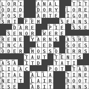 ACROSS 1. Australian parrot (variant) 5. Of or related to the anus 9. Teat (slang) 12. Wrote a lyric poem 13. Small, narrow, flatbottom fishing boat 14. Old wives' tales, e.g. 15. Airs 16. Johnson of "Laugh-In" 17. Russian composer Stravinsky 18. Indian title of respect (Mr.) 19. Opposite of masc. 21. Actors Connery and Penn 22. Have the gumption 24. Sliced dessert 26. Compass dir. 27. Sir (Sp.) 28. Past tense of be (plural) 29. French philosopher Descartes 30. Entertaining tales 32. American tennis player Robert 36. South American Indian 37. Directed 38. Moves 39. River in Europe 40. With motion or animation 42. Blunders 43. Strained 44. Portable shelters 46. White ___ sheet 49. It would 50. Jacques of French films 51. Pale purple color 53. Cooking vessel 54. Bar bill 57. Slanted text style (abbr.) 58. Silent film actress Nazimova 61. Prong on a fork 62. Remaining after all deductions 63. Den 64. Carrot, for example 65. Compass dir. 66. "This won't hurt ____!" 67. Restaurants DOWN 1. Chops off 2. Aroma 3. Home 4. Binary compound 5. First man 6. Not either 7. Tate display 8. Sodium hydroxide 9. Ancient Roman robes 10. Metal shackles 11. Laconic 14. Whopper 19. Away 20. Suggestive of the supernatural 21. Observe 23. Approach 24. Hangs 25. Big collection agency 27. Post 28. Take or capture by force 29. River (Sp.) 31. Verbally 32. Representative 33. Casting lots 34. Possessive pronoun 35. Curvy letter 40. Floor covering 41. Von Bismarck 43. Nervous spasm 45. Ingest 46. Place in a line 47. Settings 48. Having winglike extensions 52. The first octave above the treble staff 53. Role in a play 55. At once, immediately (arch.) 56. Antes 58. Insect wing 59. Experiment locale 60. Cards in a Roman deck? 61. Three (prefix)
