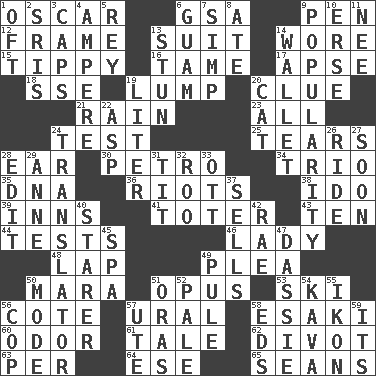 ACROSS 1. Witty Wilde 6. Girls' org. (abbr.) 9. Animal enclosure 12. Movie unit 13. Set or collection 14. Had on 15. Likely to tip or tilt 16. Docile 17. Domed church section 18. Compass dir. 19. Mass 20. A slight indication 21. Water falling in drops from the sky 23. 100% 24. Trial 25. Pulls into pieces 28. Hearing organ 30. Stone: prefix 34. Musical group of three 35. Heredity factor (abbr.) 36. Disturbances 38. Wedding promise 39. Lodging establishments 41. Carrier 43. "___ Little Indians" 44. Trials 46. Kenny Rogers chart-topper in '80 48. Pet locale 49. Entreaty 50. Hindu Mythology: god of death 51. Musical composition 53. What Jean-Claude Killy likes to do 56. ____ d'Azur (French Riviera) 57. Mountain range 58. 1973 Nobel Price Winner (Physics) Leo 60. Aroma 61. Falsehood 62. A piece of turf (Scot.) 63. For each 64. Compass dir. 65. Seines DOWN 1. Often (poetically) 2. Indian titles of respect 3. Smile enhancers 4. Electrical Unit 5. Marina Del _, California 6. Island territory of the United States 7. Simple or foolish person 8. Had dinner 9. Teen's desire 10. Celtic language 11. Born 13. Make senseless or dizzy 14. Place for singles 19. 61 cubic inches 20. Feline 22. Viper 24. Interpreter 26. Travel on an animal 27. Within a short period 28. Prepare for publication 29. Queen of England 1702-14 31. Teat (slang) 32. Friend of Pooh 33. Baseball player Mel 37. Makes a sale 40. A viewer who gazes fixedly 42. Actress Charlotte 45. Health resort 47. Hyrax 49. Whine 50. Method 51. Mouths or openings 52. Light colored 54. Polynesian shrub of the pepper family 55. Visual representation of an object 56. Police officer (slang) 57. Shoshoni 58. Begley and Asner 59. ___ a Wonderful Life