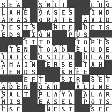 ACROSS 1. Ocean 4. Stricken, poetically 8. Nilotic language 11. Unable to walk 13. Fertile tracts in a desert 15. Indiana (abbr.) 16. Ancient river in northeast Turkey 17. Declaim 18. Enthusiastic 19. Trials 21. To riddle 22. Wagers 23. Begley and Asner 24. Electrically charged atom 27. Ichor 29. "Tell ____ the Marines!" 30. Drinks excessively 34. "___ Little Indians" 36. Frog relative 39. Dodge 40. Baby powder 41. Flexible twig of a willow tree 43. ____ Bator, Mongolia 44. At full speed 46. Celtic language 47. Scottish cap 48. Looks after 49. Leg joint 51. Lizard (obsolete) 53. Title for a knight 54. Put into a specified state 57. An important port of Yemen 60. Rowing implement 63. Place in a line 65. Table seasoning 66. Beach, in Buenos Aires 69. Having or resembling wings 70. Part of HMS, perhaps 71. Artist's stand 72. Plant holders 73. Compass dir. 74. A home for chicks 75. Perceive with the eye DOWN 1. Schedule 2. Having ears or earlike features 3. Collect or gather 4. "Barney Miller" actor Jack 5. Third mo. 6. Austrian river, tributary to the Danube 7. False hair 8. Not recorded 9. A single undivided whole 10. Likelihood 12. Eastern Standard Time (abbr.) 14. Ooze 18. Utter; complete 20. Be seated 25. "Beetle Bailey" pooch 26. Trap for birds or small mammals 28. Shoshoni 29. Event 31. Monetary unit of Botswana 32. Dutch treat 33. Elected rep. 34. Docile 35. Liveliness 37. Wind 38. Writing tables 40. Make lace 42. Painter Guido (1575-1642) 45. Overdraft (abbr.) 50. Period 52. Drink excessively 54. Grain storage towers 55. Related on the mother's side 56. Laconic 57. American tennis player Robert 58. Raised platform 59. Otherwise 61. ____ Jay Lerner 62. Raze (variant) 64. Pet locale 67. Affirmative reply 68. Keyboard modifier key