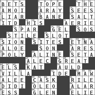 ACROSS 1. Wagers 5. Drink excessively 9. Definite Article 12. Mine, in Marseilles 13. Like ___ of sunshine 14. Perceives with the eye 15. One who doesn't tell the truth 16. Object of repulsion 17. Table seasoning 18. It would 19. Part of HMS, perhaps 21. Nest on high 22. Practice fight 24. Set 26. Mayday 27. Vertical member of a panel or frame 28. Position in a hierarchy or organization 29. The Jewish people; Israel 30. Settings 32. Inactive volcano in Sicily 36. _ vera 37. Boy, to dad 38. Ancient Greek god of war 39. More than one (prefix) 40. Place in a line 42. Stalk of a moss capsule 43. Actor Baldwin 44. Relatively large 46. Raised railways 49. Krazy ___ of comics 50. Old (Scot.) 51. Country residence 53. Binary compound 54. Opening into something insatiable 57. Toward shelter 58. Keg 61. Cause heat under the collar 62. "You Light Up My Life" star Conn 63. Butter sub 64. Having or resembling wings 65. Curvy letter 66. Small, secluded valley 67. Writer Wiesel DOWN 1. Indonesian resort city 2. Give off 3. Inedible or poisonous agaric 4. Title for a knight 5. Bar bills 6. Mouth or opening 7. Baking dish 8. Sight organ 9. Separates forcefully 10. Sun: prefix 11. _____ Park, CO 14. Compass dir. 19. Actor Linden 20. Angers 21. Keyboard modifier key 23. Abounding in pines 24. American astronaut and politician John 25. Greek goddess of the dawn 27. Grain storage tower 28. Unemotional 29. Plant excrement 31. Small island 32. Artist's stand 33. Excercise machine 34. Remaining after all deductions 35. White ___ sheet 40. In the manner of 41. Mild oath 43. Alias (abbr.) 45. Regret 46. Elude 47. Ms. Damita and namesakes 48. Bobsleighs 52. Flowery wreath 53. Picture 55. Jai ____ 56. We are 58. Gear tooth 59. 100% 60. Perceive with the eye 61. Actress Charlotte
