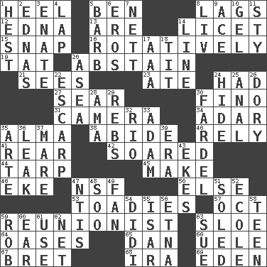 ACROSS 1. Person who is morally reprehensible 5. Benjamin's nick name 8. Straggles 12. Pulitzer Prize-winning author Ferber 13. "We ___ not amused" (Victoria) 14. It is permitted: Lat. 15. Fastener 16. Producing rotation 19. Make lace 20. Refrain by choice 21. Perceives with the eye 23. Had dinner 24. Possessed 27. Wither 30. A pale, very dry sherry 31. Device for capturing images 34. The sixth month of the Jewish calendar 35. _ mater 38. Tolerate 40. Have trust in 41. Tail end 42. Flew 44. Canvas cover 45. Cause to be 46. Supplement with great effort 47. Overdraft (abbr.) 50. Otherwise 53. Sycophants 57. Sep. follower 59. One who advocates reunion 63. A type of plum 64. Fertile tracts in a desert 65. One of the 12 tribes of Israel 66. Ubangi River tributary 67. Cy Young winner Saberhagen 68. Retirement account (abbr.) 69. Locale of original sin DOWN 1. Behest 2. Ferber et al. 3. Maternal 4. Pet locale 5. Sharp remark 6. Greek god of love 7. Remaining after all deductions 8. 54 in ancient Rome 9. Adept person 10. Set 11. Filthy place 14. Actor's bit 17. American Automobile Association (abbr.) 18. Teat (slang) 20. Toward the sea 22. Fortification 24. Flintstone garb 25. Of or related to the anus 26. Rowboat 28. Nanny (var.) 29. Confederate soldiers (slang) 30. Burden 32. River (Sp.) 33. First of billions? 35. Johnson of "Laugh-In" 36. Path through which fluid escapes 37. Female horse 39. Period 43. Makes supply last 47. Nuclear Threat Initiatives 48. "Barney Miller" actor Jack 49. Avid follower 51. Having a sole or soles 52. Learning spot: Fr. 54. "You Light Up My Life" star Conn 55. Austrian river, tributary to the Danube 56. Inactive volcano in Sicily 58. Adolescent 59. Director Reiner 60. Hearing organ 61. Purpose 62. Fish or hair follower 63. Take to court